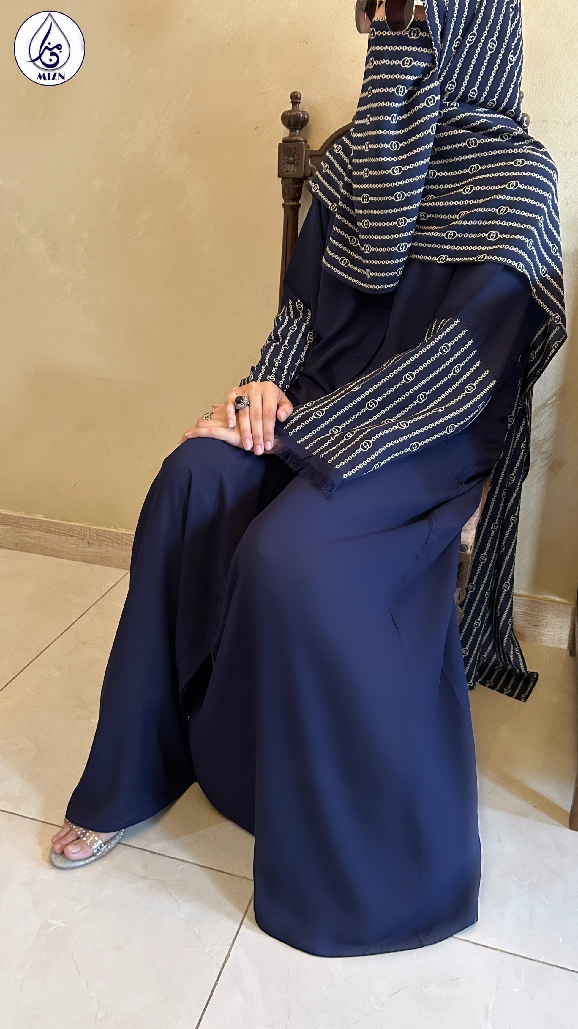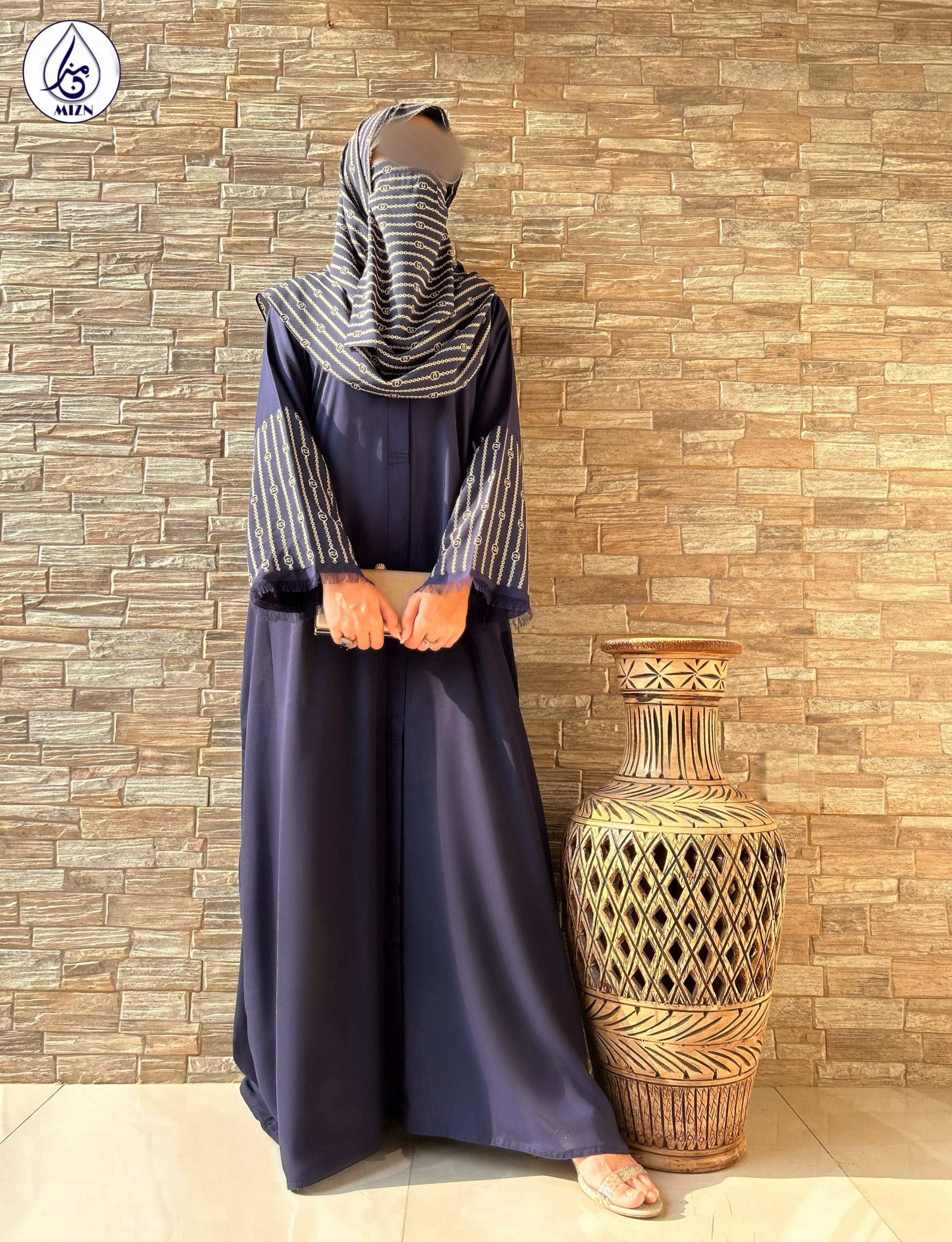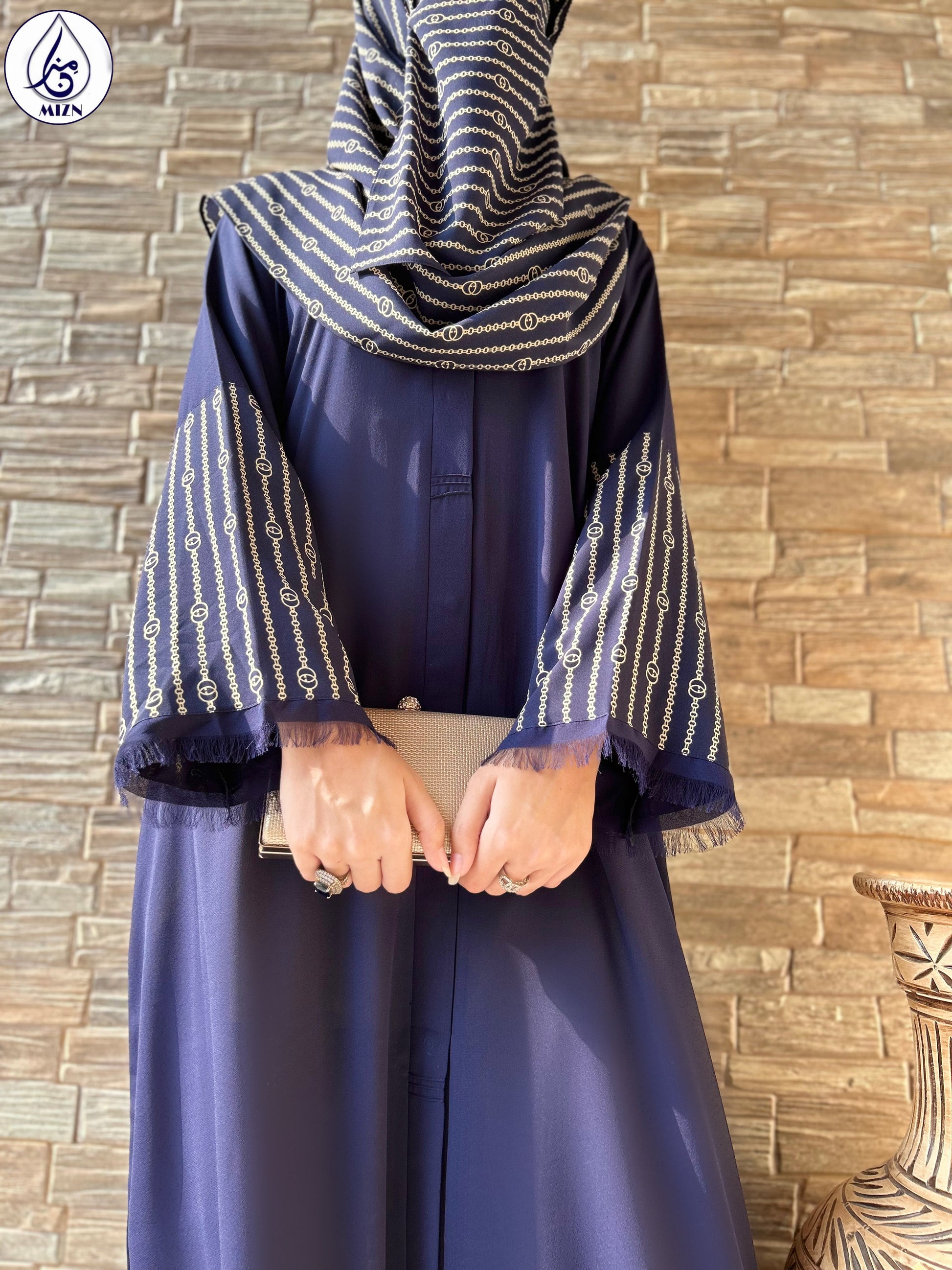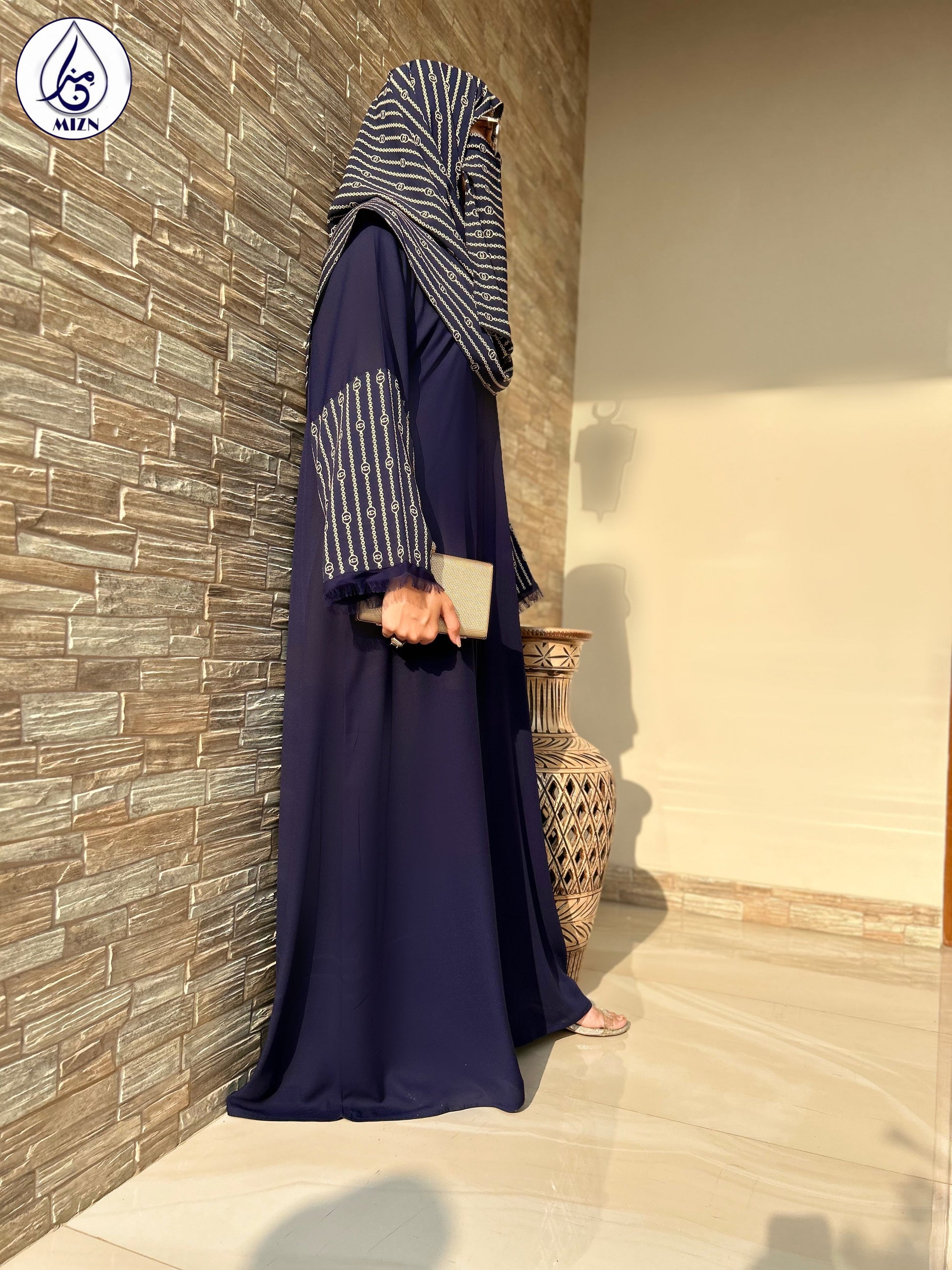 One can never have too many blue abayas. A modern abaya design with printed sleeves and hijab.