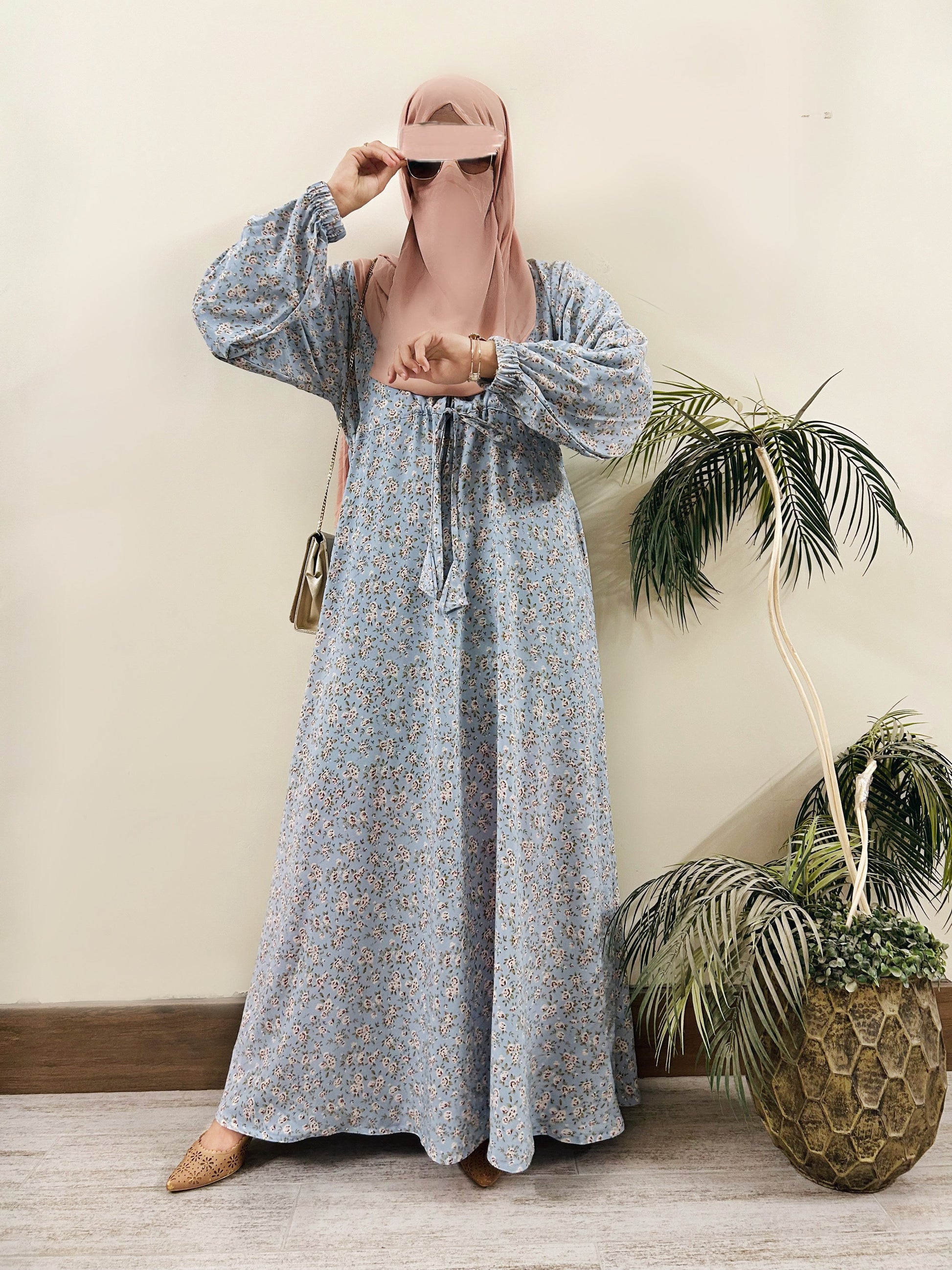 Bringing you a a wonderful light pink design with unique print. This summer abaya will keep you looking cool this season