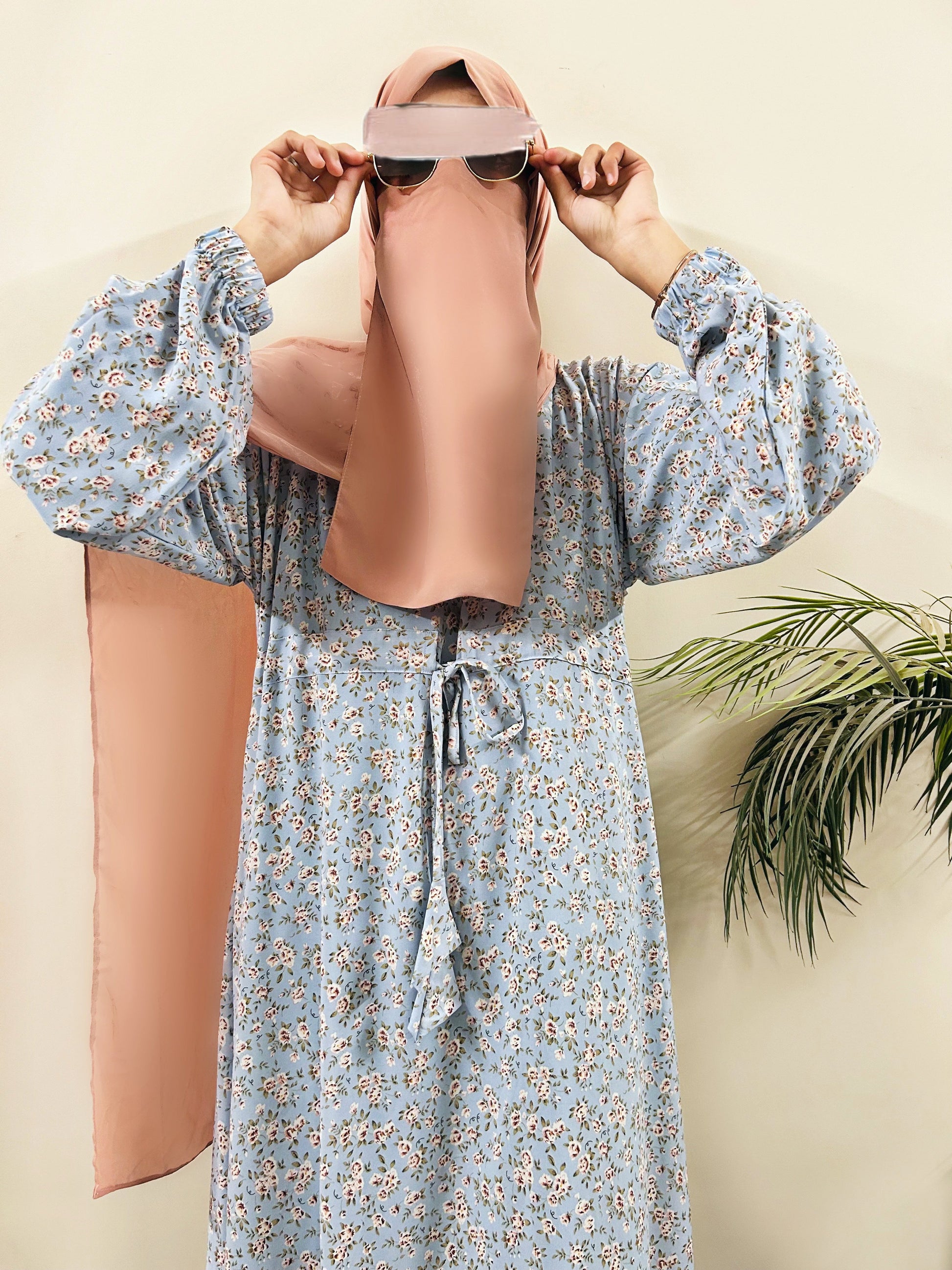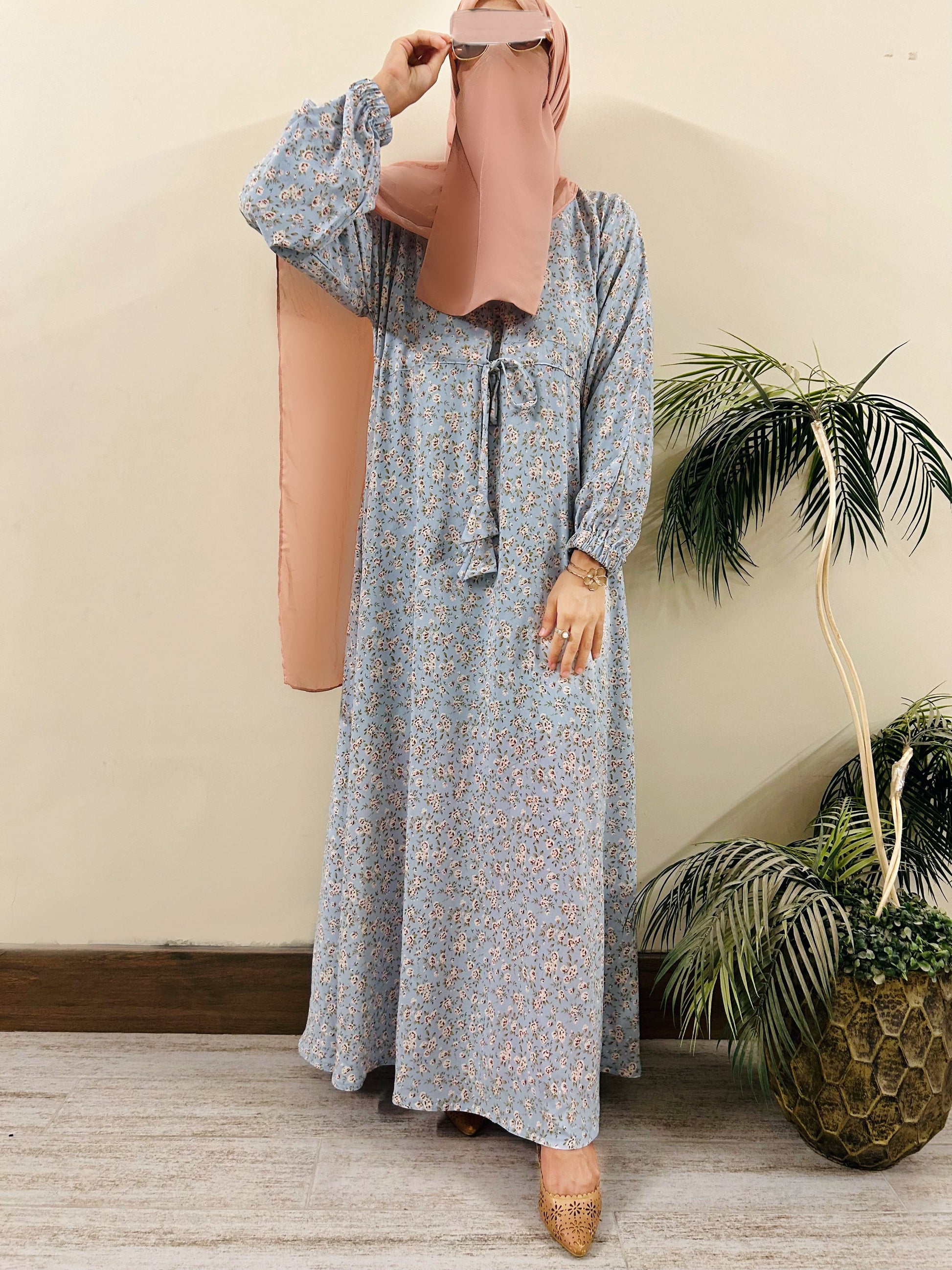 The intricate printed abaya with soft colour radiates elegance. Pair it with white or light pink hijab to complete the look!