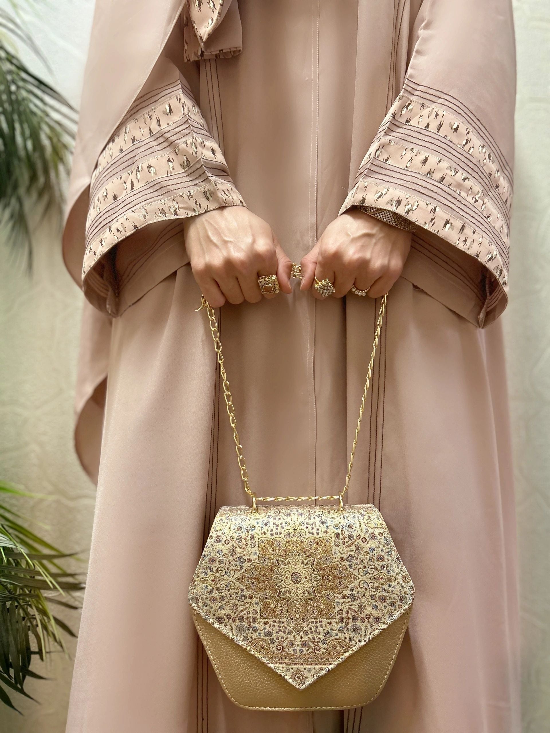A blush pink abaya with printed sleeves. This abaya design has the softest color.