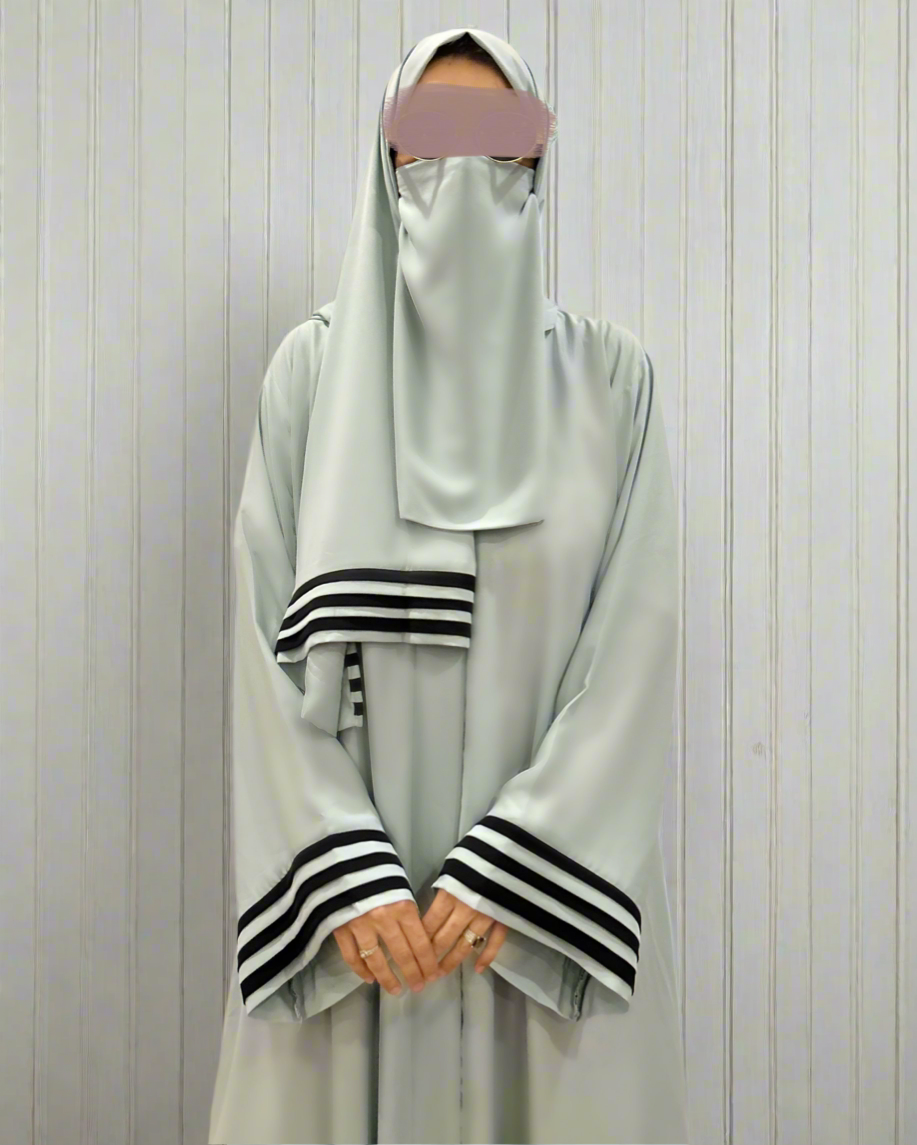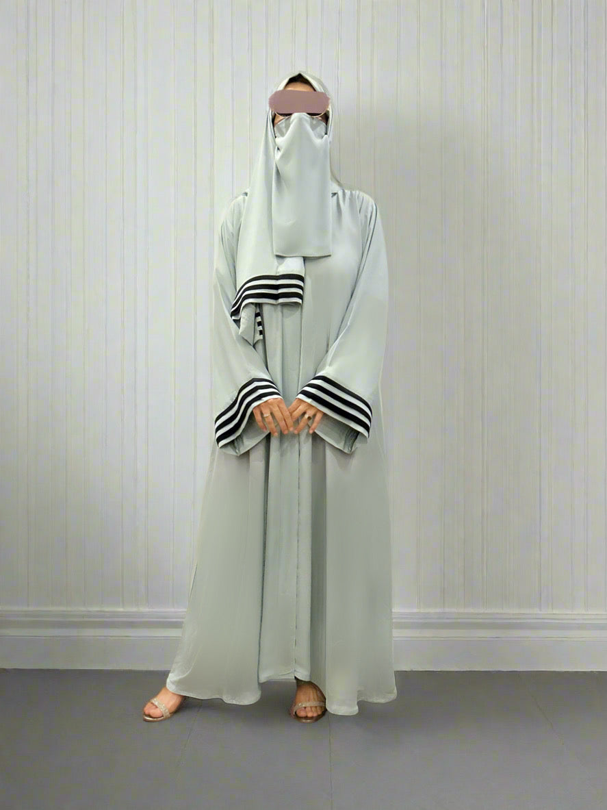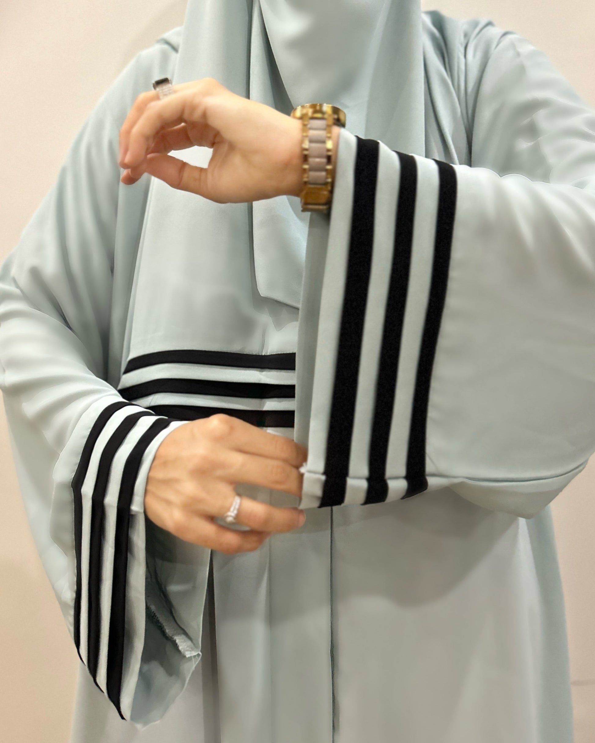 This ice blue abaya with black classy sleeves is a perfect daily wear abayas. It is basic, plain and elegant. A simple abaya design which is summer friendly.