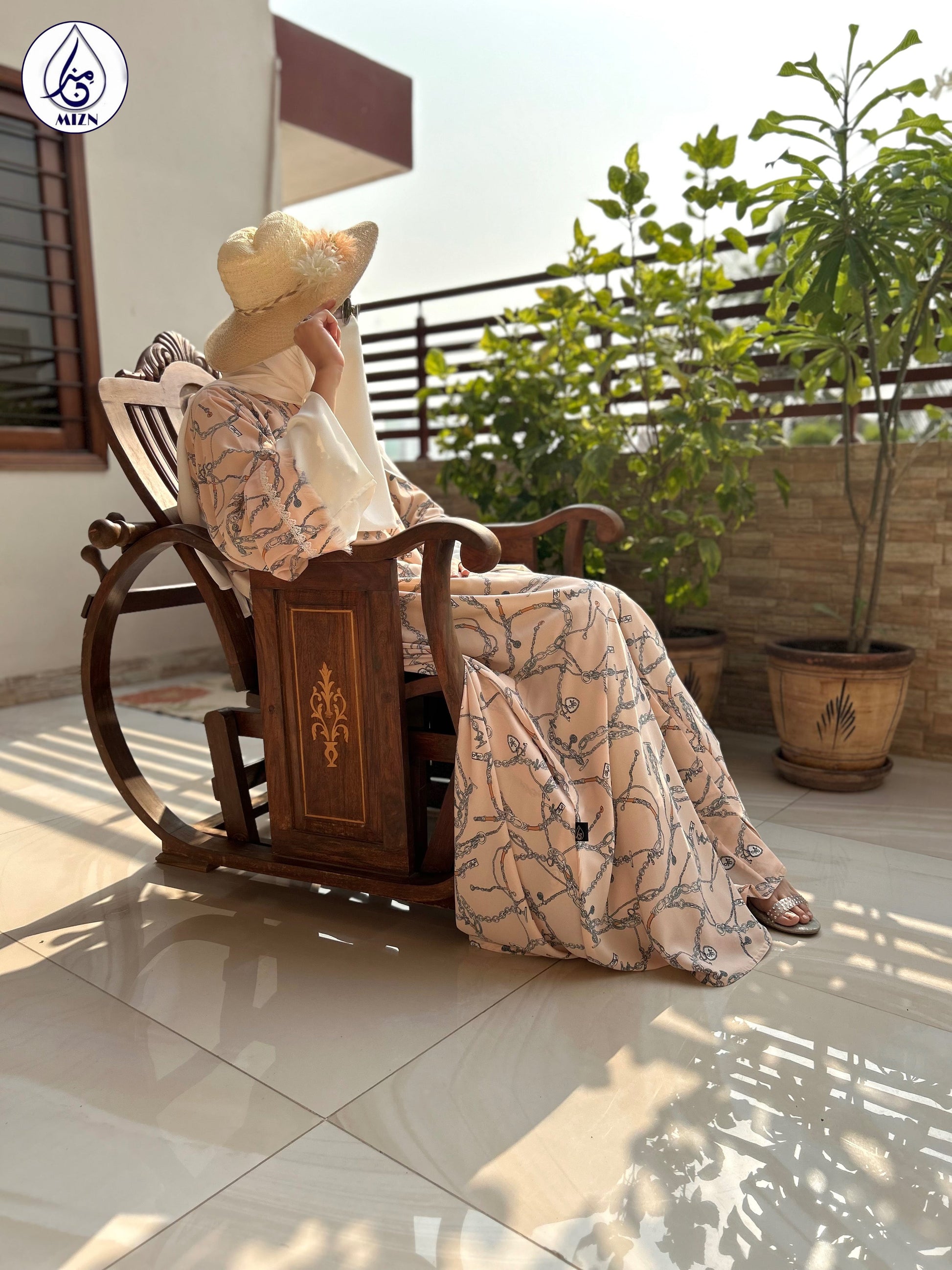 Bringing you a a wonderful light pink design with unique print. This summery abaya with soft colour radiates elegance. Pair it with white or light pink hijab to complete the look!