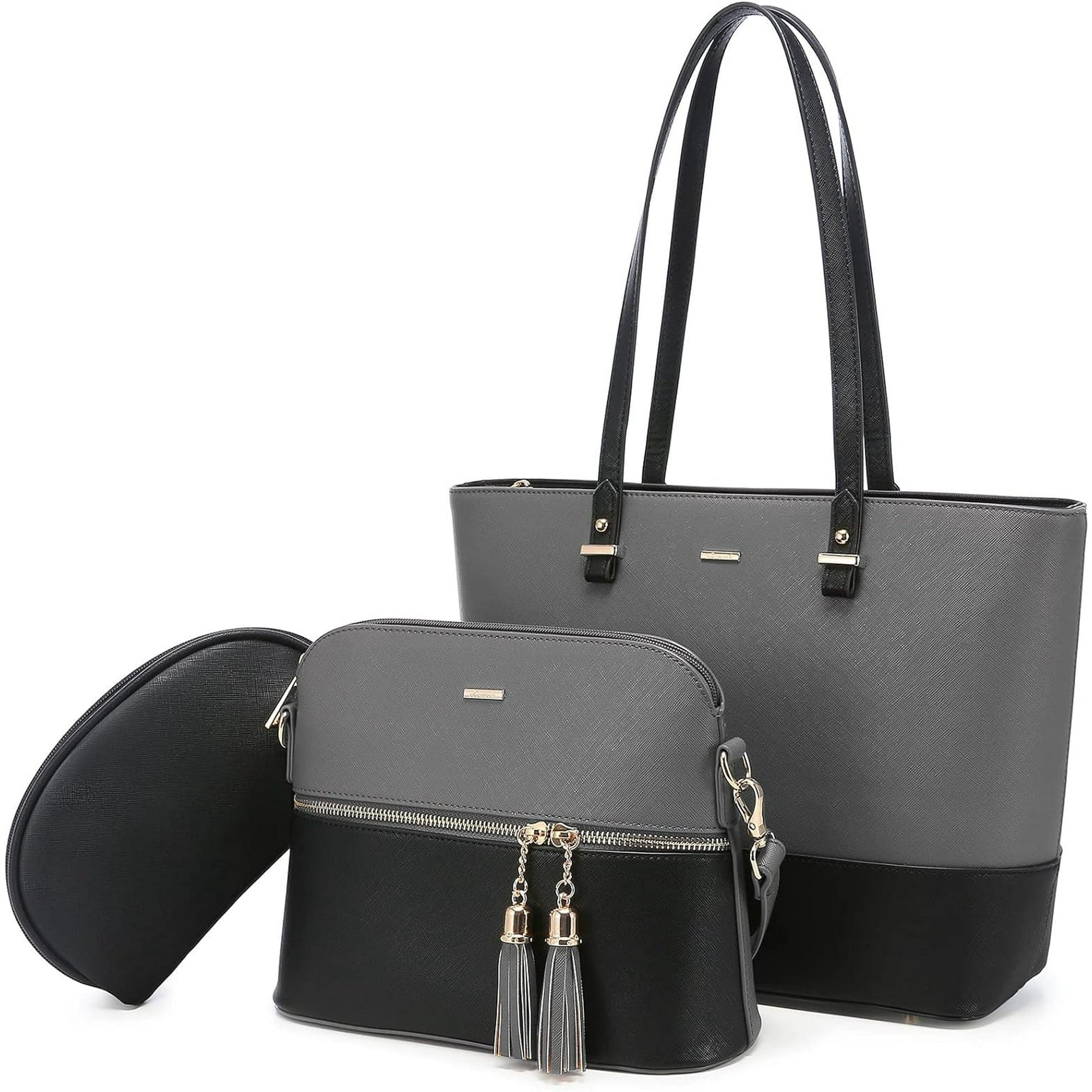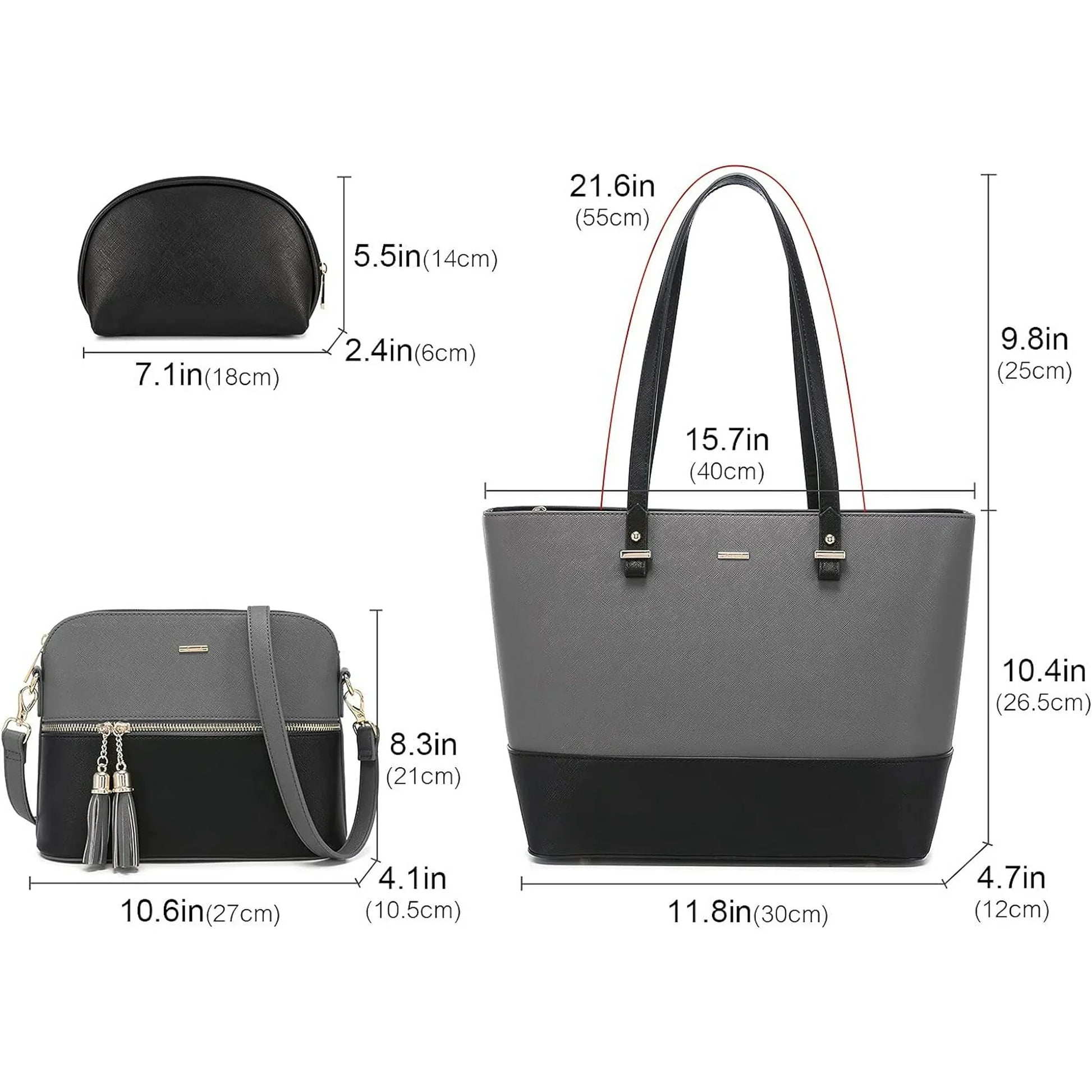 The Dream Grey and Black 3 Piece Handbag is both spacious and stylish. Includes a large tote (27x31 cm) and crossbody (21x28 cm) with a two-tone color scheme and tassel detail. Perfect for everyday use.