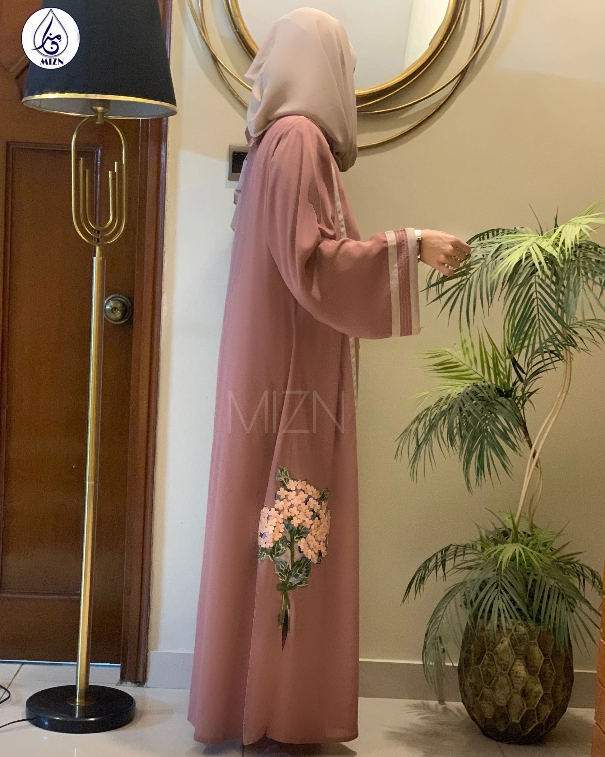 A pink abaya with bunches on sides. Made from breathable Korean georgette this summer friendly abaya is your go to choice for all occasions