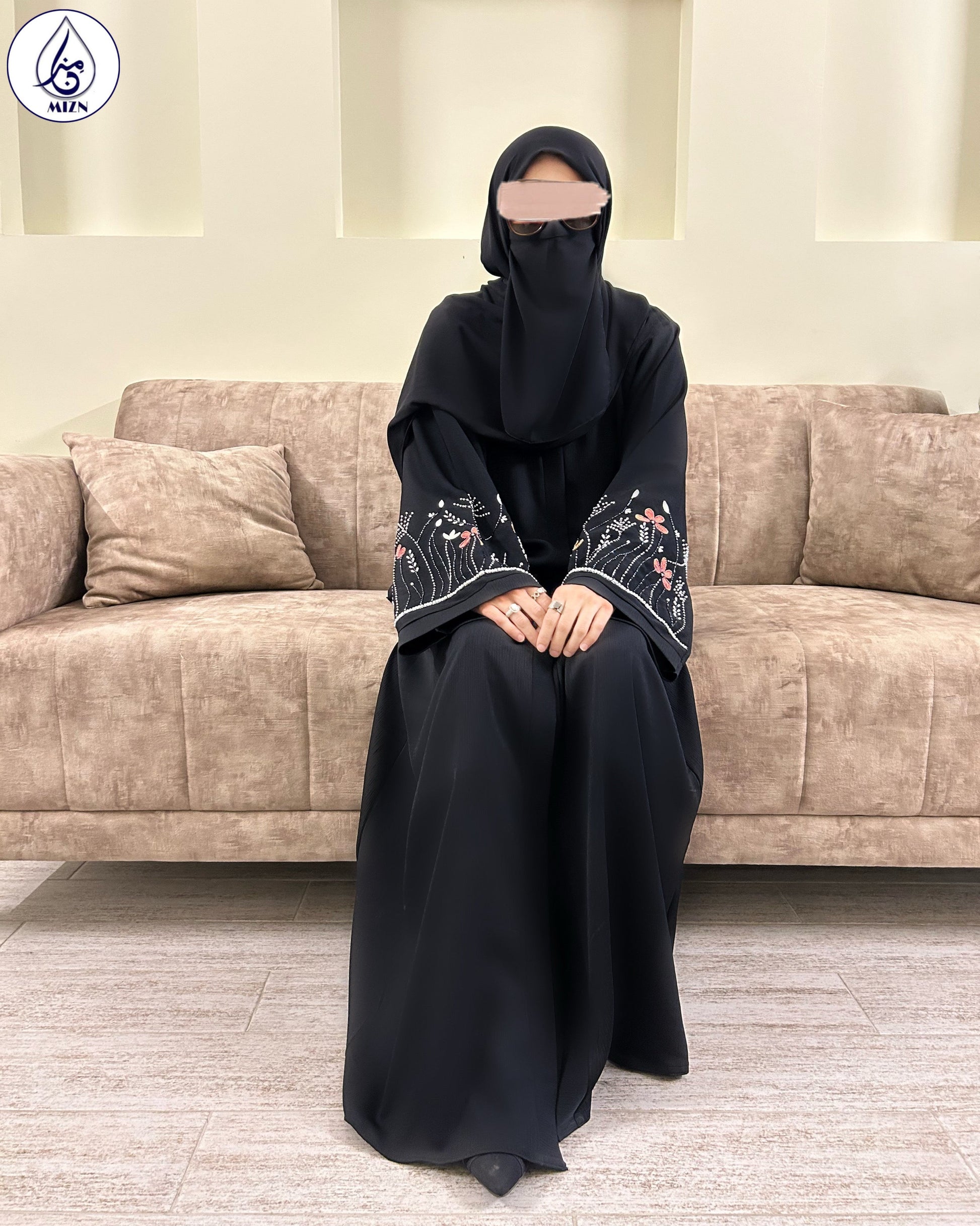 A black wedding abaya that is classy and elegant. The delicate embroidery on sleeves and luxury abaya fabric makes this eid abaya a must have😍