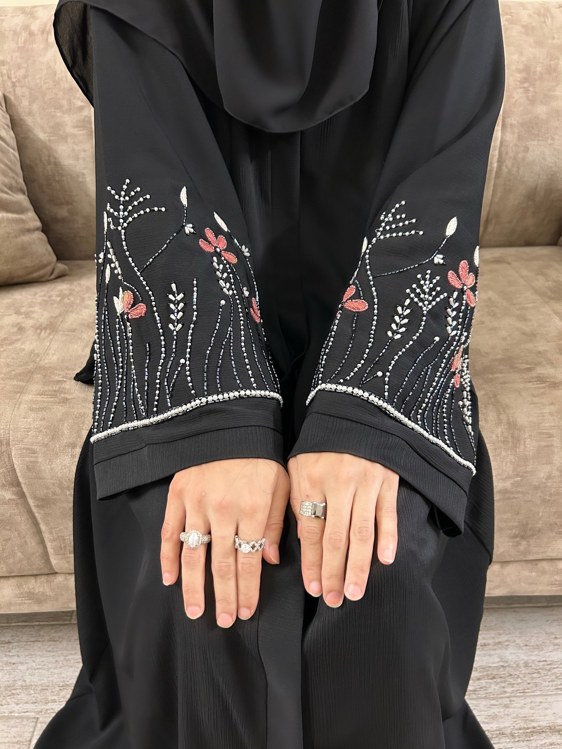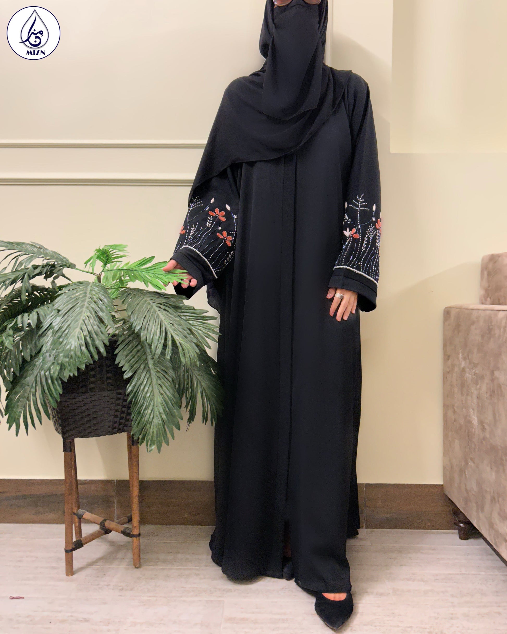 This luxurious zoom abaya with embellished sleeves consisting of detailed handwork is a festive abaya everyone will love