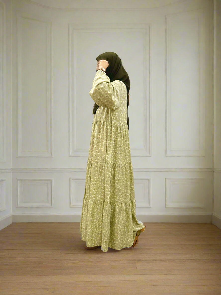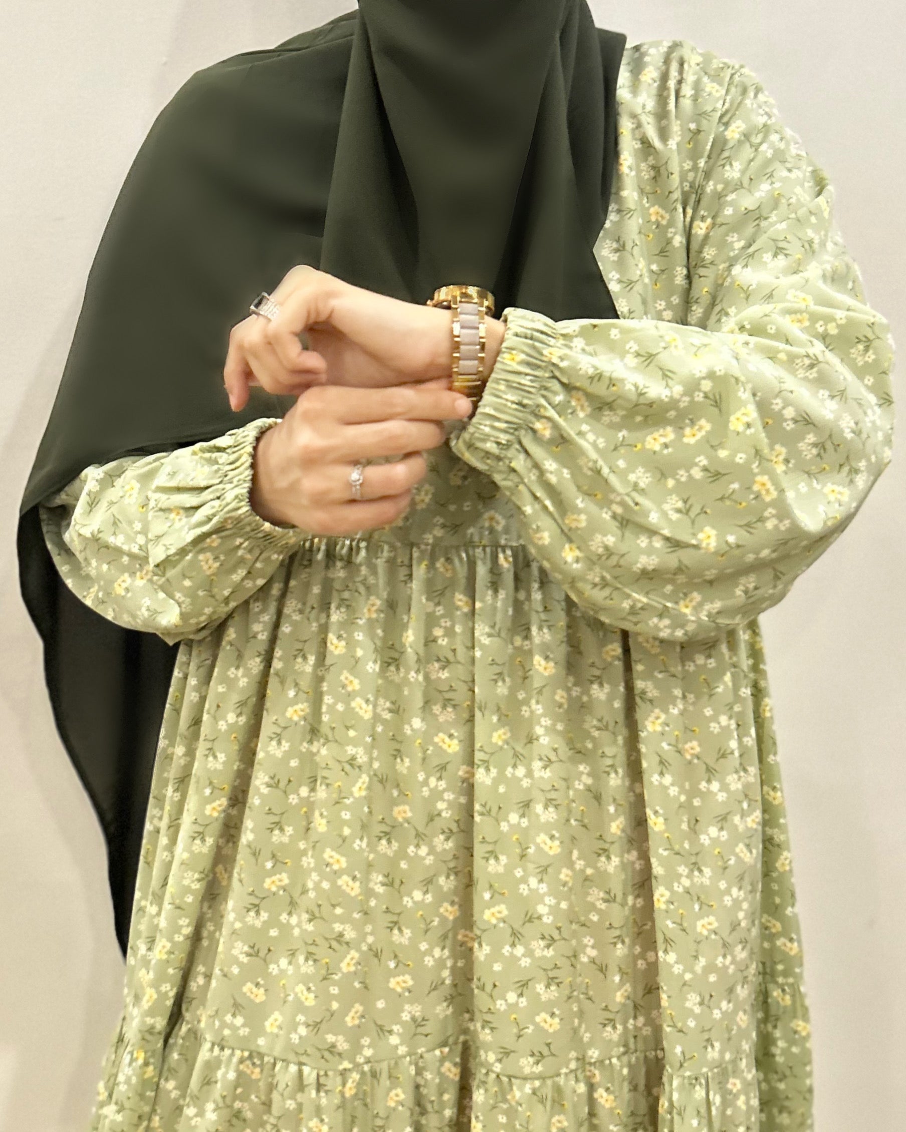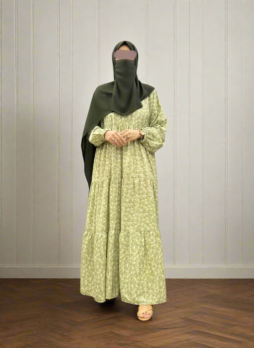 A light green abaya gown with 3 tiers & elastic sleeves. This floral abaya reminds you of fresh lime on a hot day. Made of summer friendly Korean georgette, this abaya is lightweight and breathable. The flair of this printed abaya makes it looks gorgeous ❤️