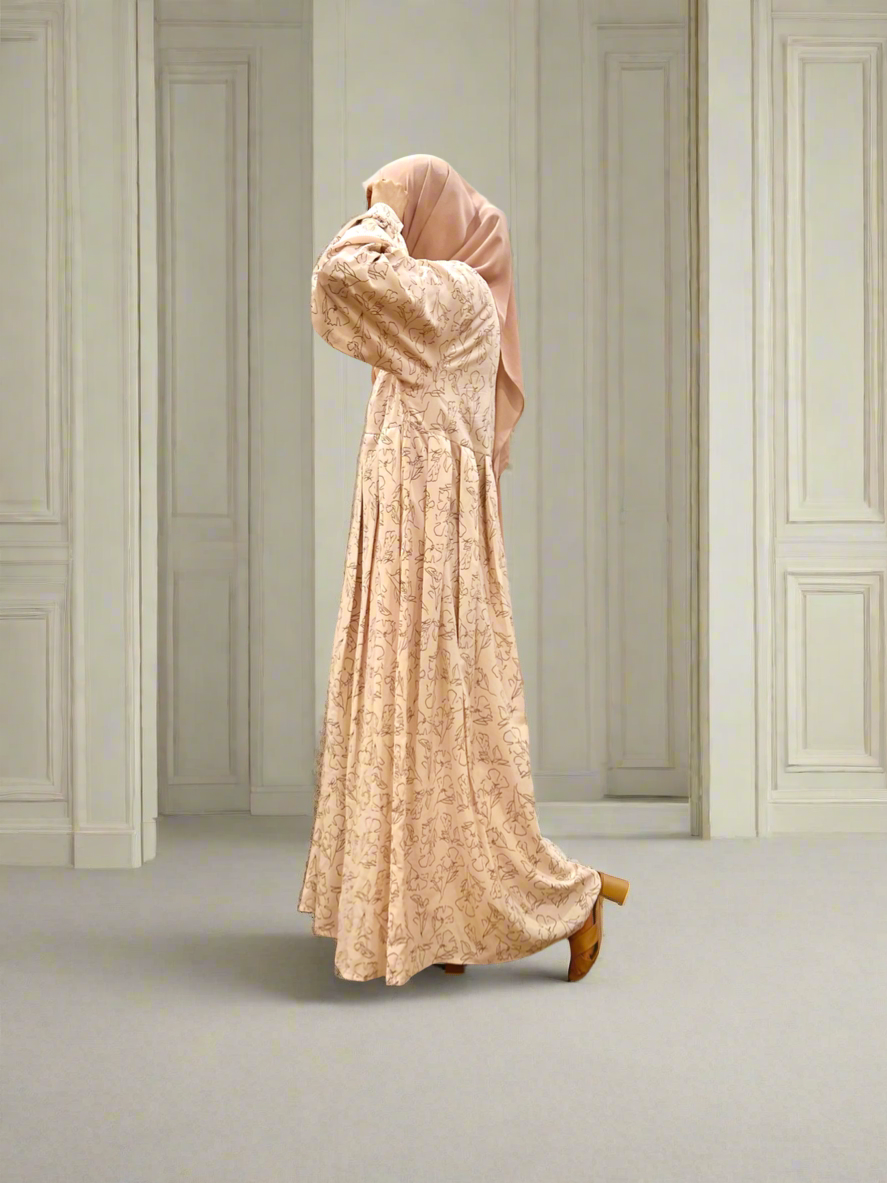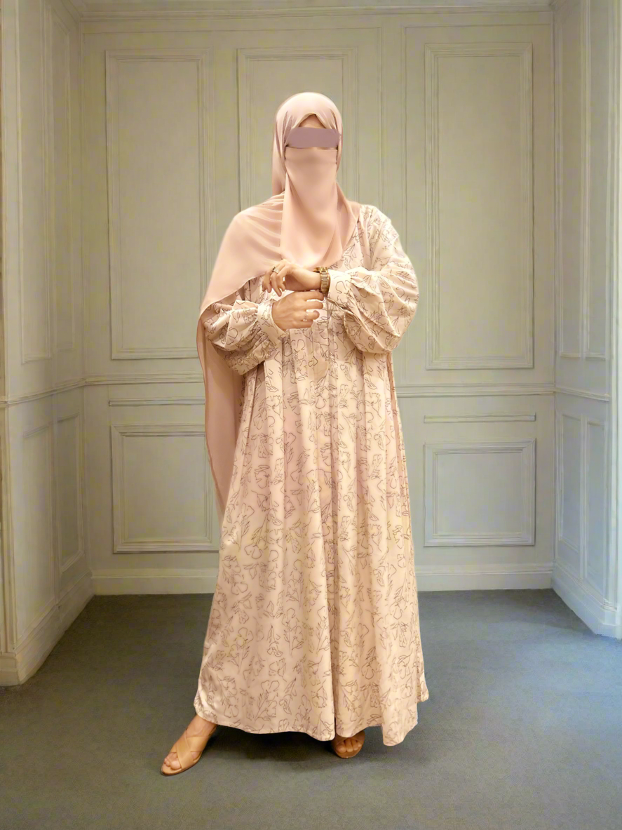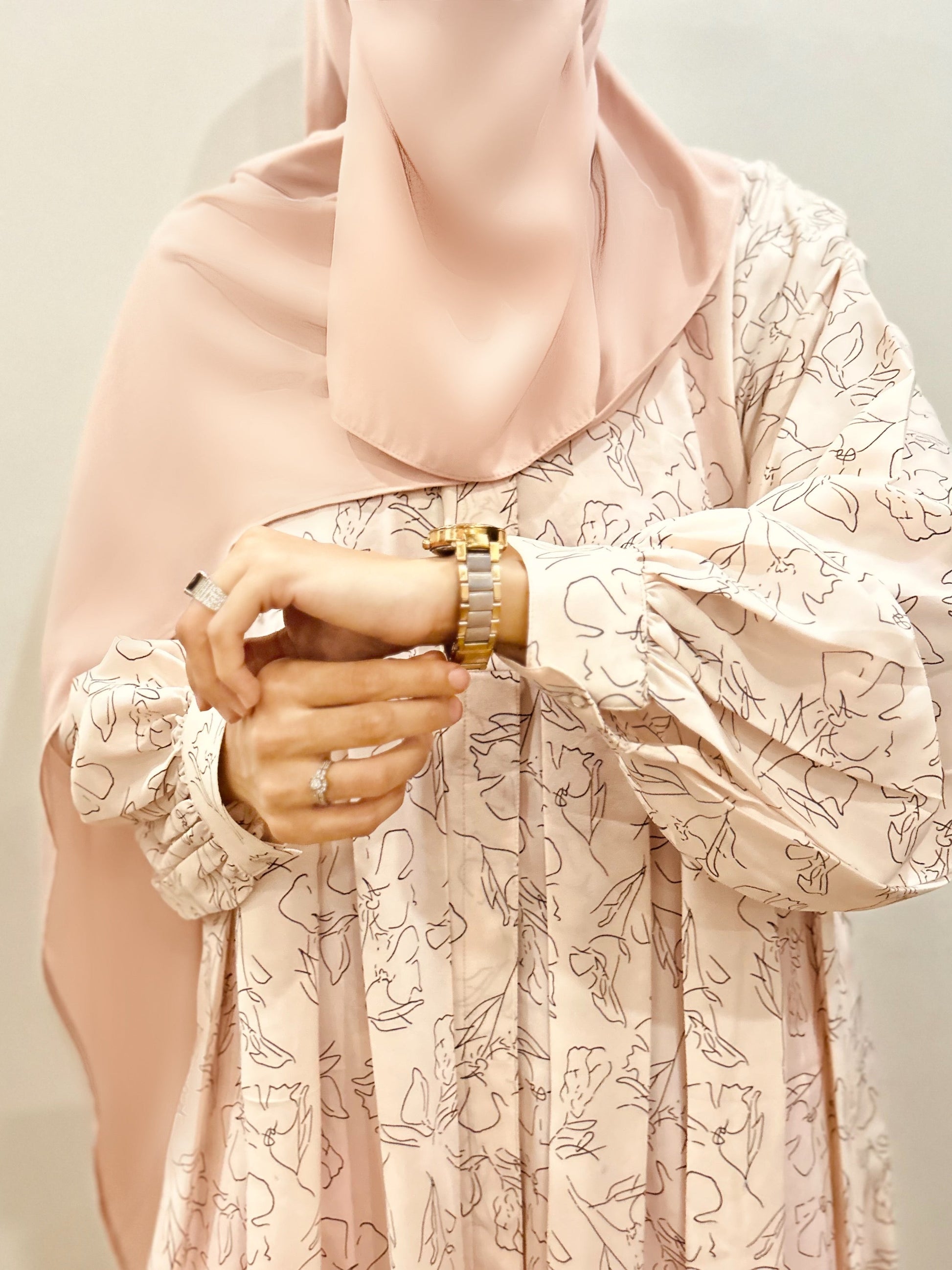 A printed abaya with soft hues and pleats that reminds you of frothy iced coffee. This summer abaya with its unique print, cuffed sleeves & pleated style makes it breezy. A daily wear abaya that is breathable and oozes class