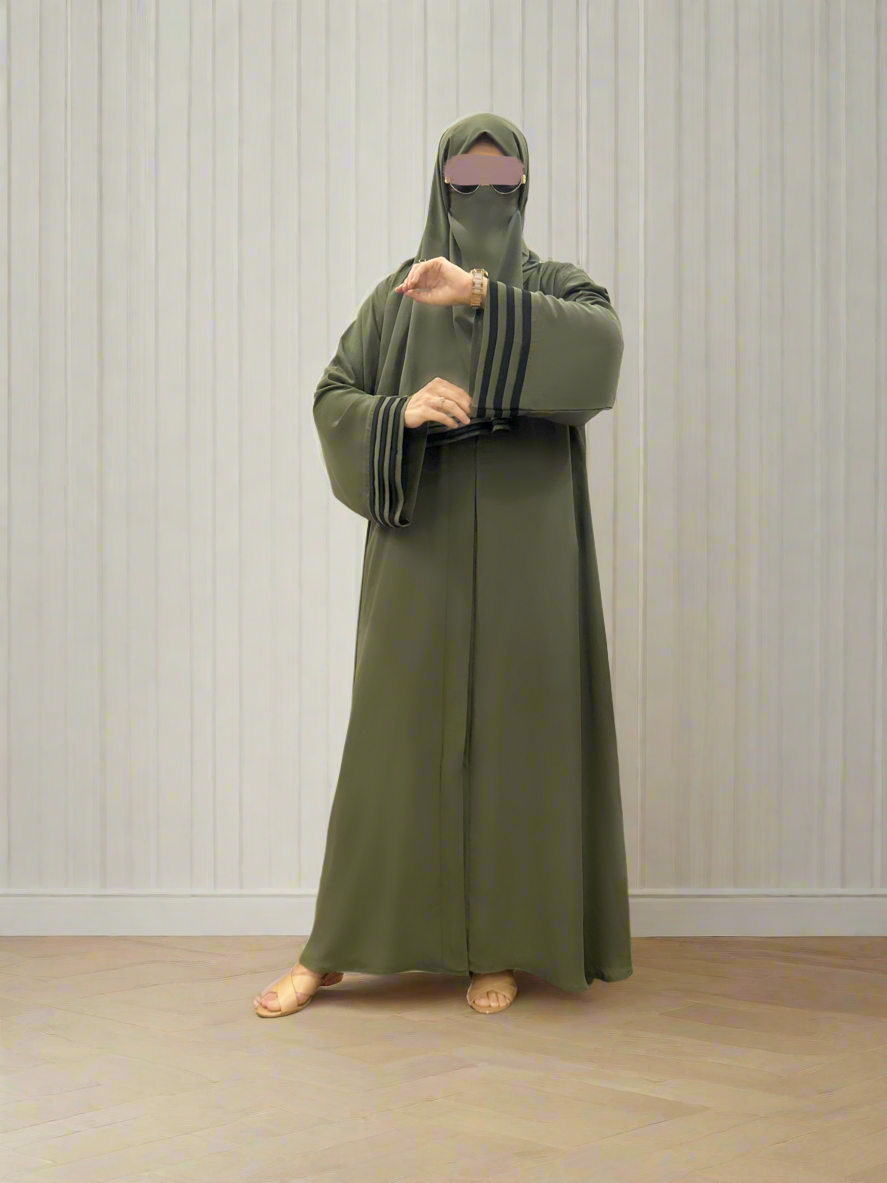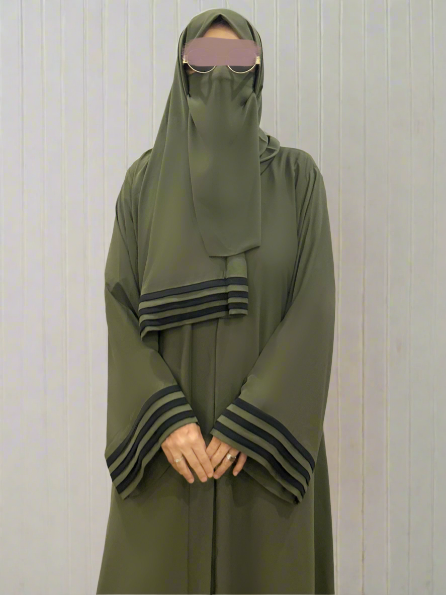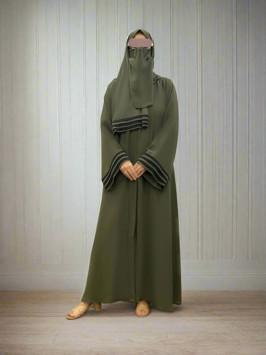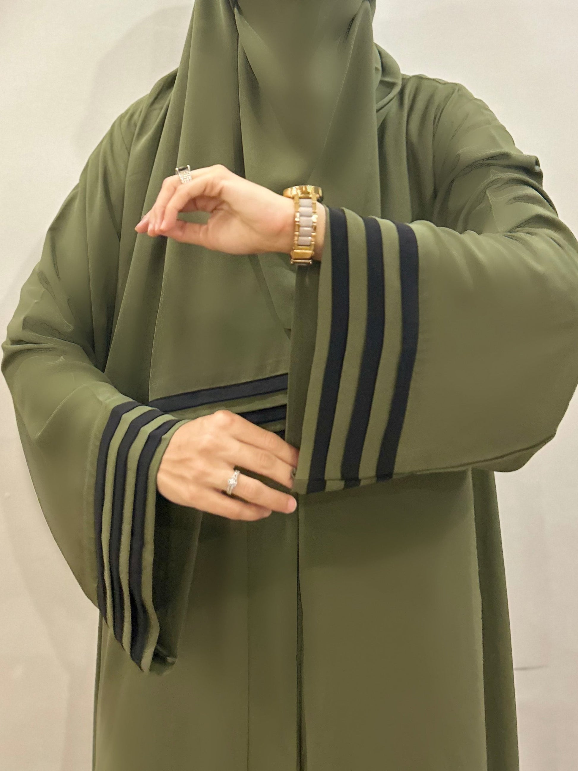 An olive abaya with a touch of black to enhance the look. This masterpiece its made with premium Korean georgette to give it fall and flow. Its summer friendly abaya and make the perfect addition to your modest wardrobe