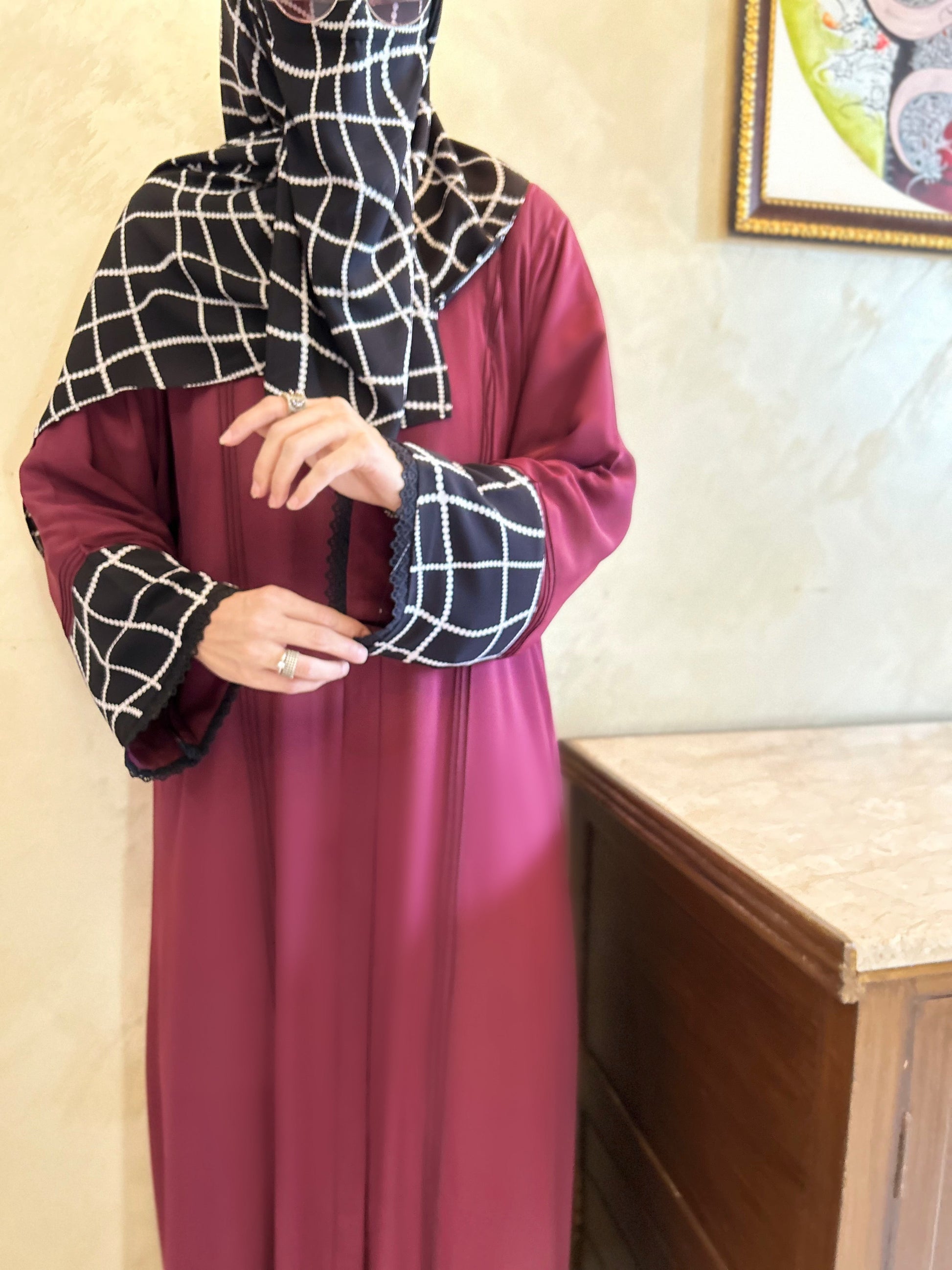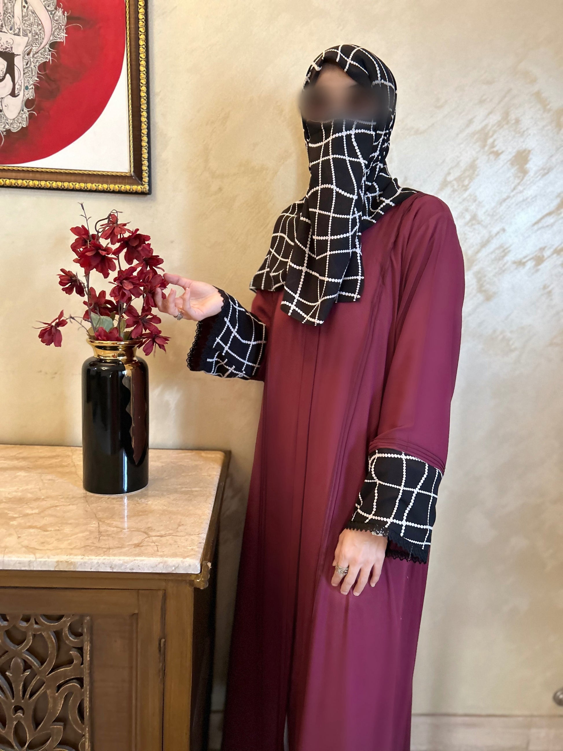 A Maroon abayas with geometric stole to give a freah vibe. This summer rock the shades of maroon and black in a stylish manner. Be modest be beautiful in this beautiful abayaA chic abaya for women who prefer a minimalist style.