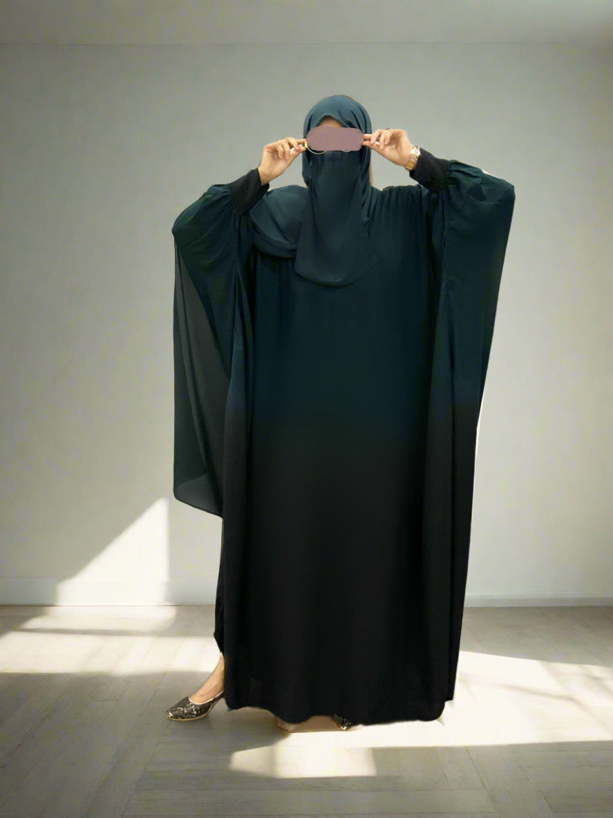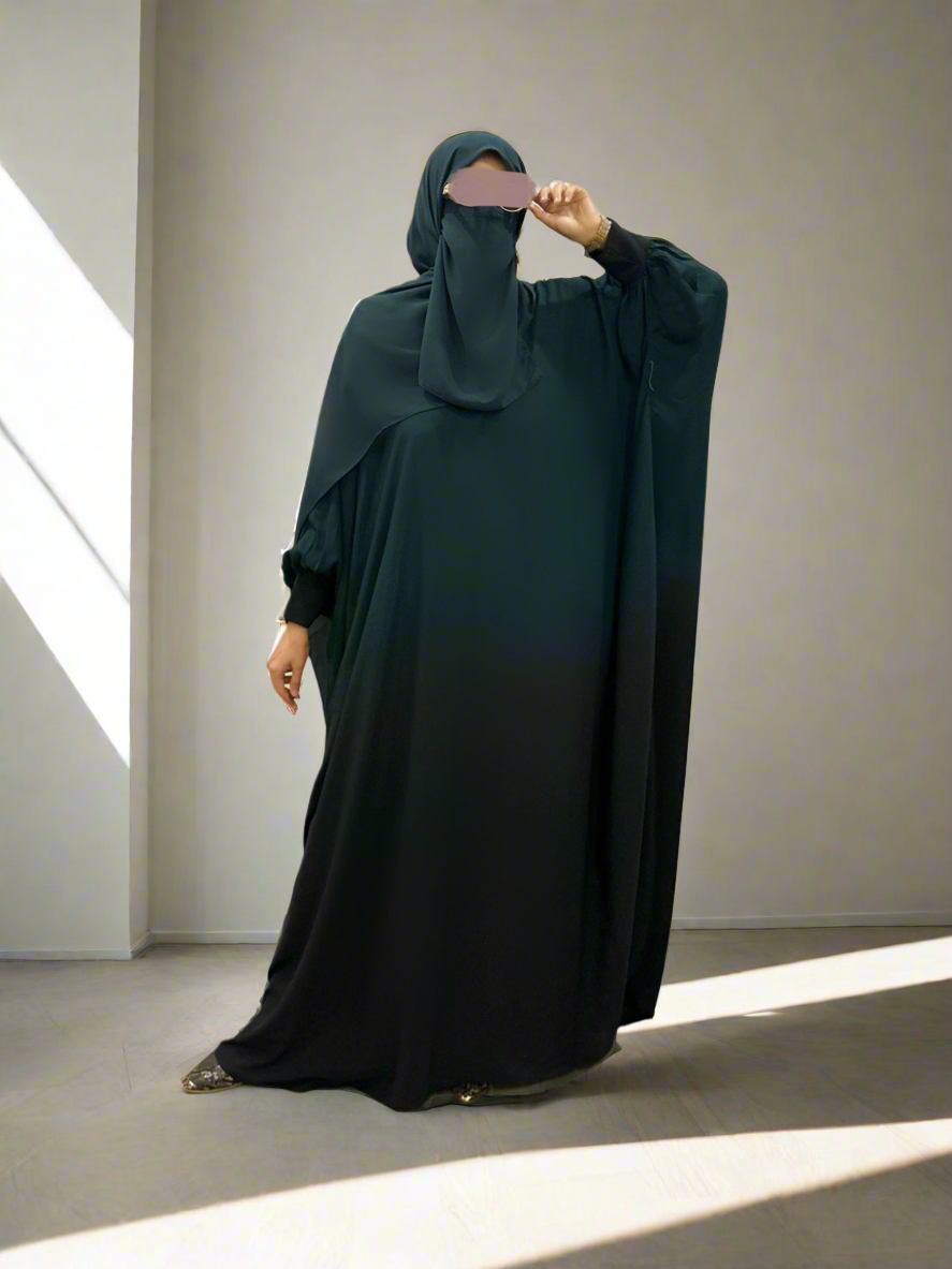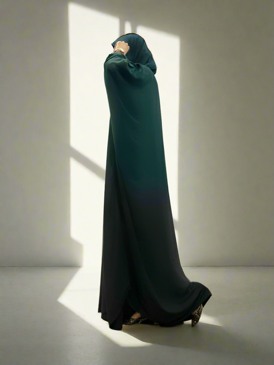 A green abaya with bold shades just like a forest. This dark toned abaya with its cool hues and light fabric is perfect for summers. The kaftan design of abaya and extra flair completes the look.