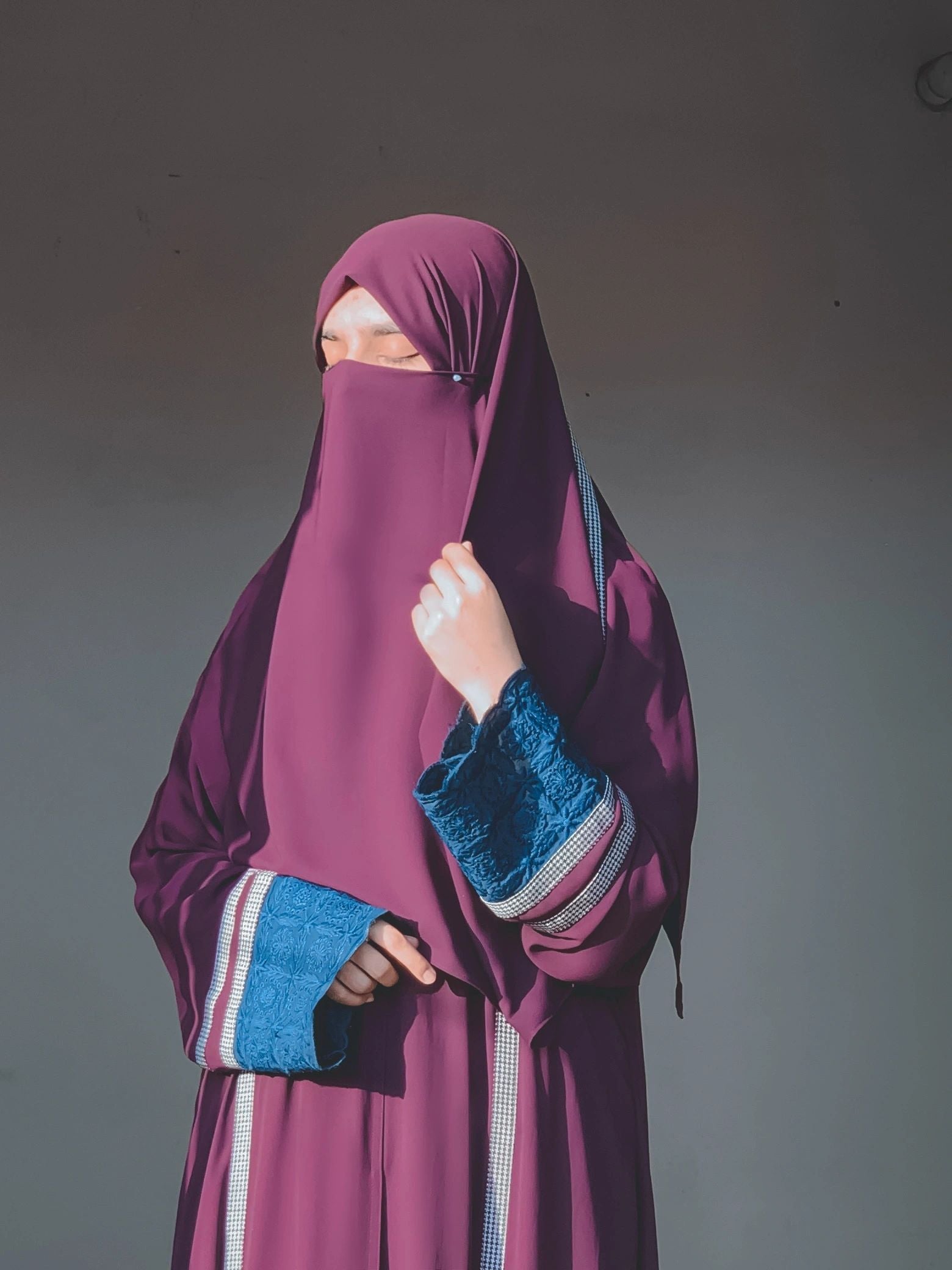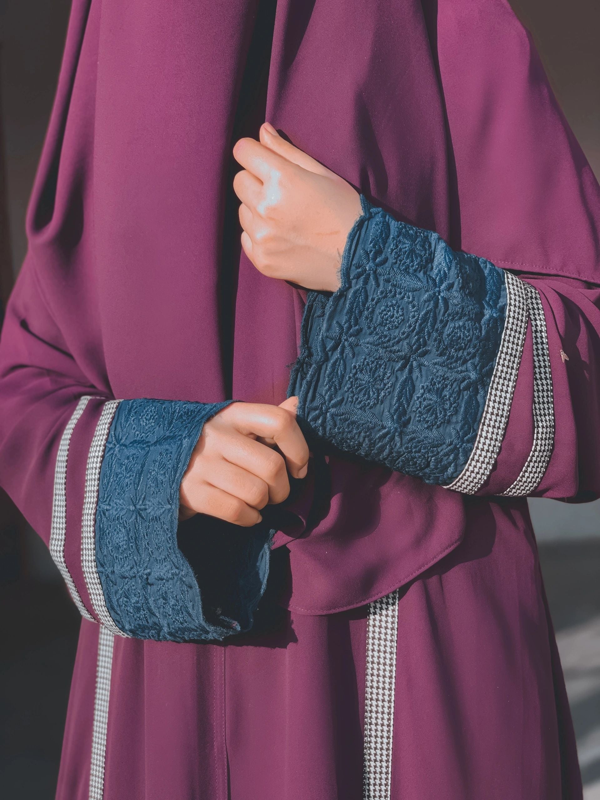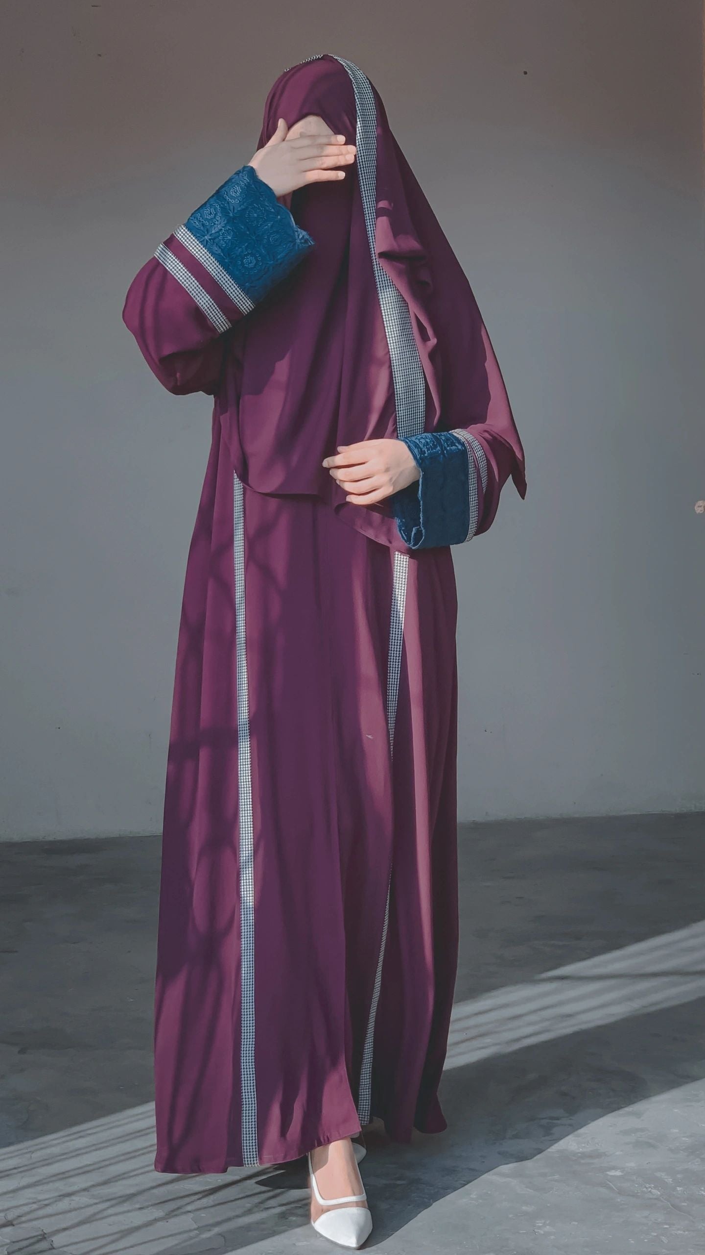 An exotic abaya with the most wanted shade of purple combined with teal. The panelling and printed details makes it super chic.