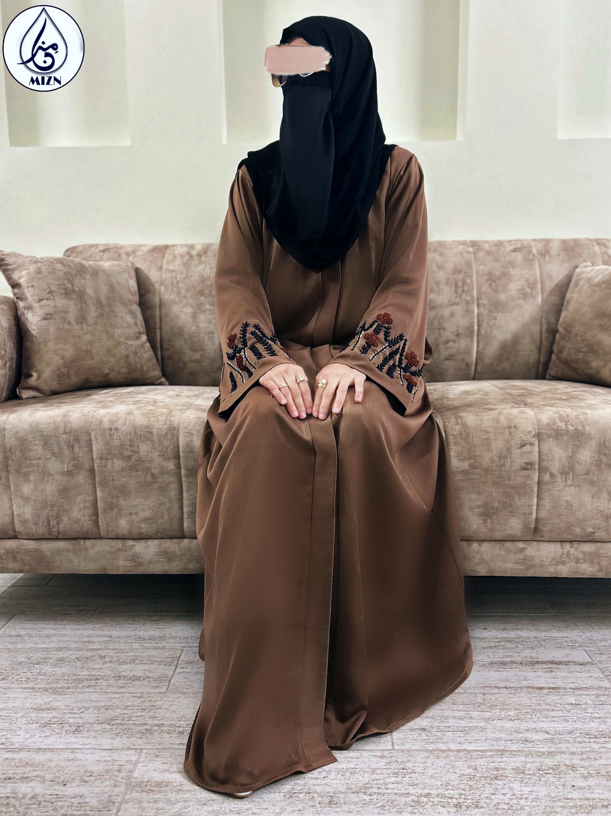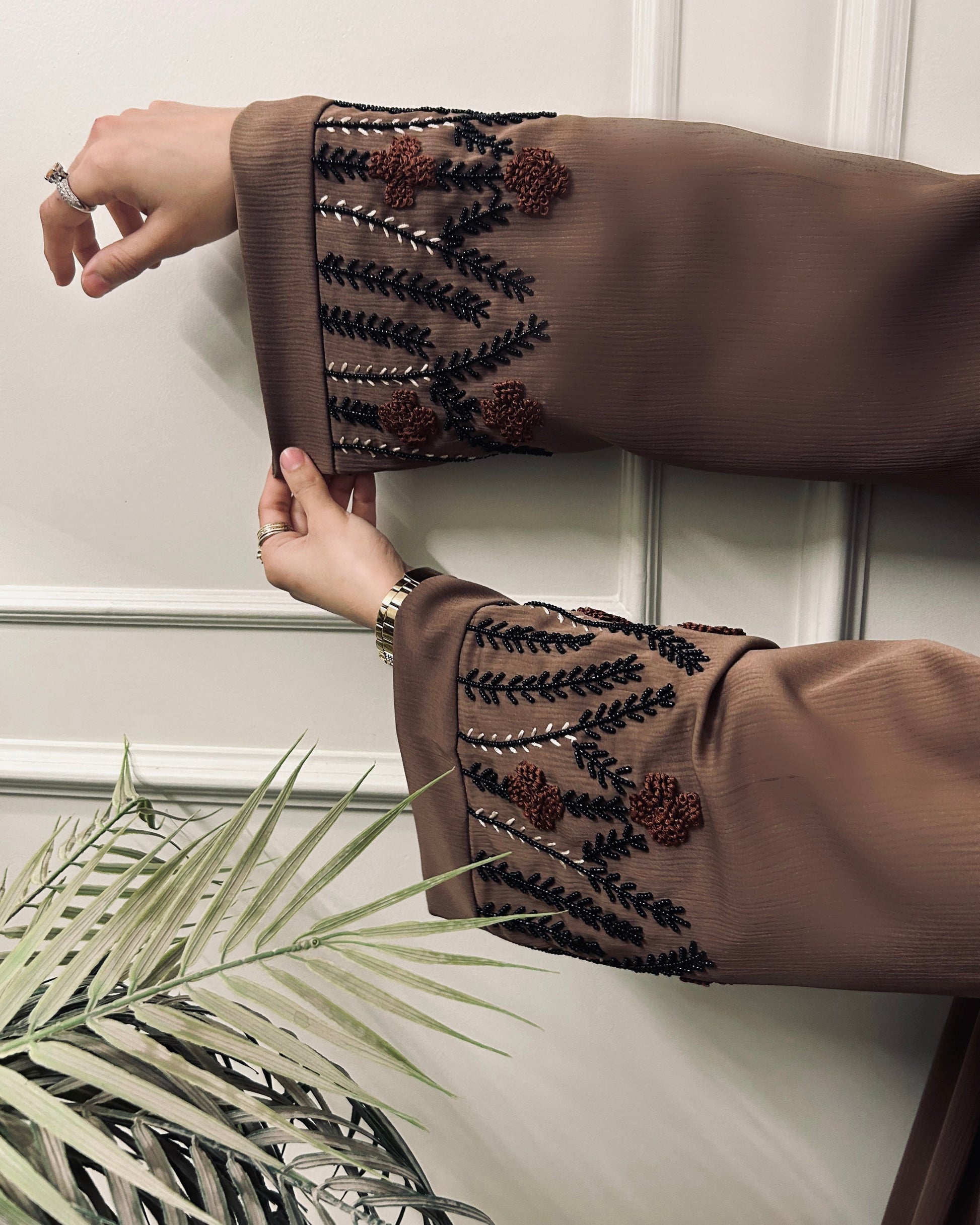 A brown wedding abaya that is classy and elegant. The caramel color with delicate embroidery on sleeves makes this eid abaya a must have😍