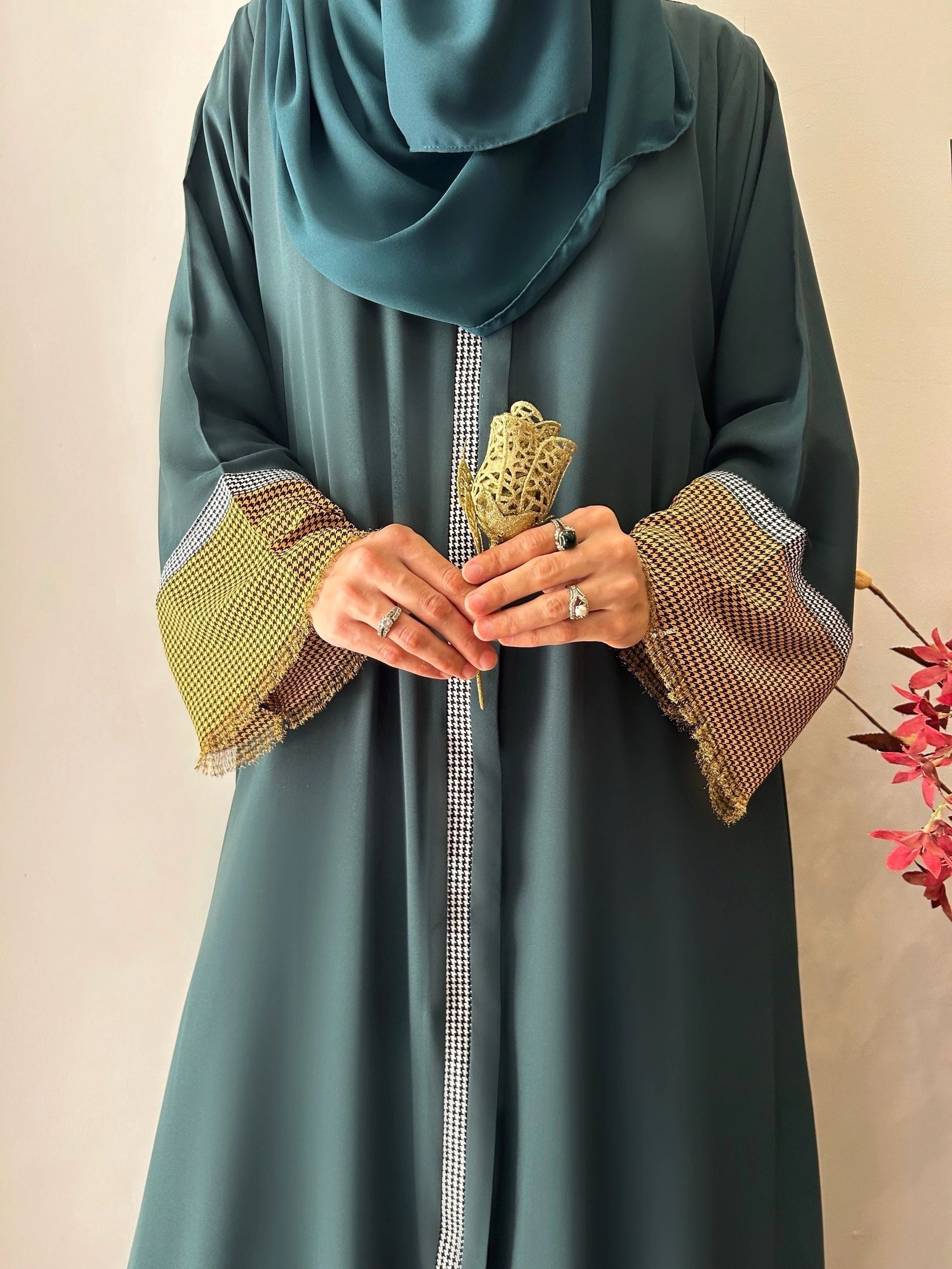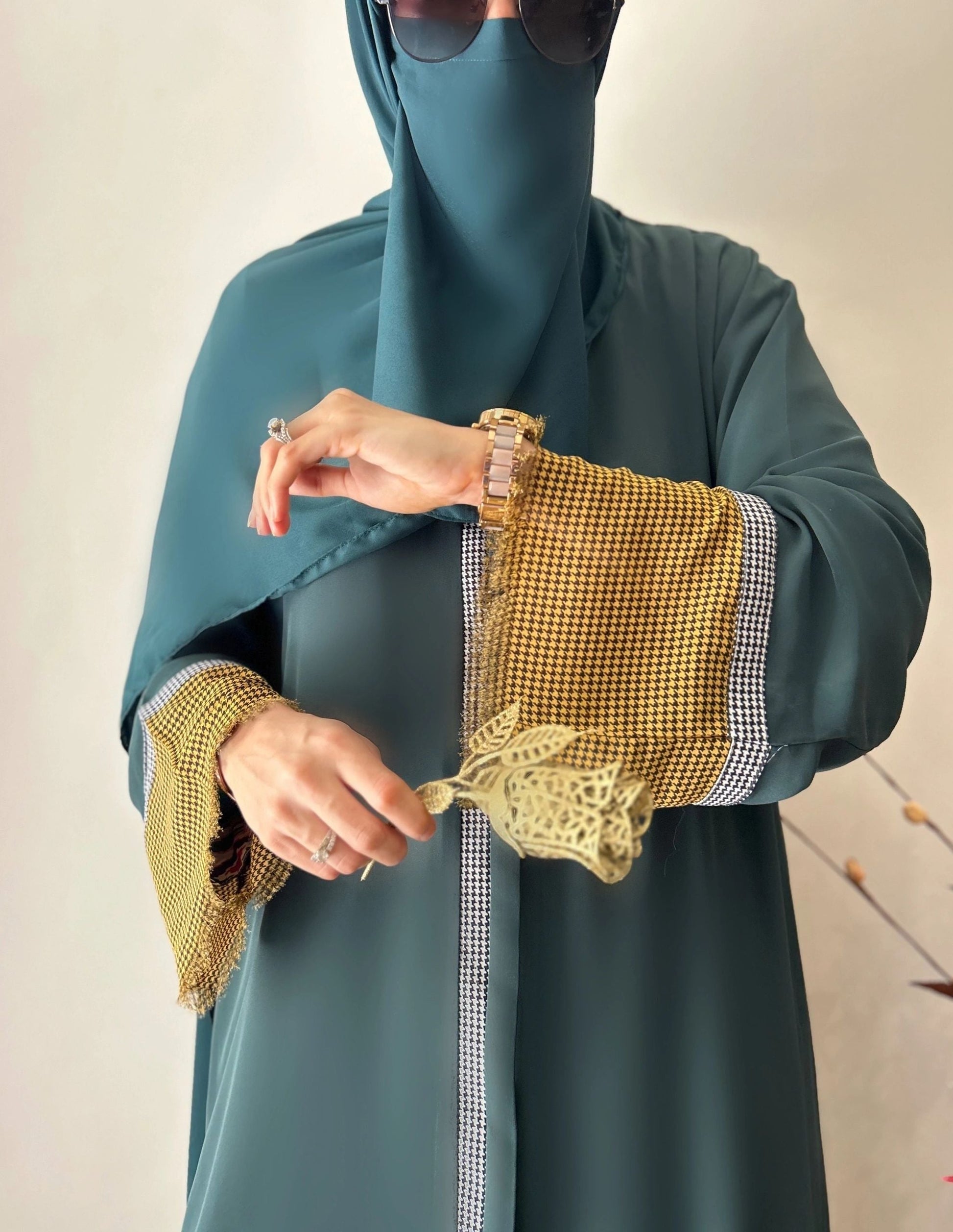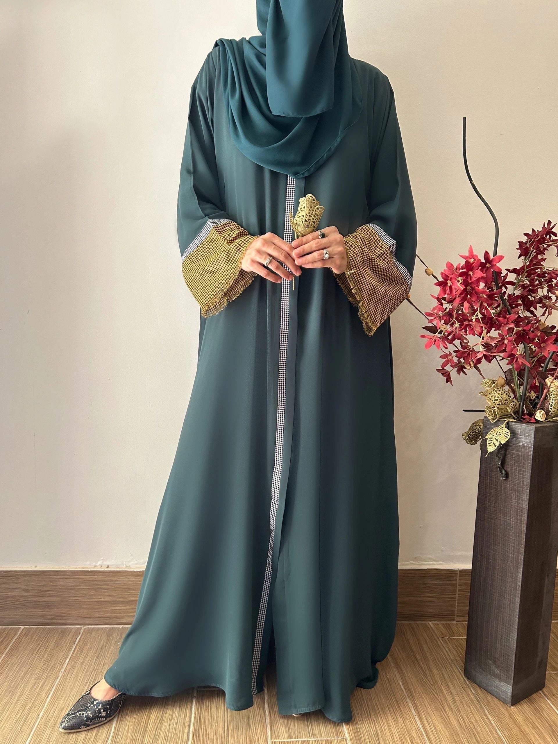 Where mustard meets emerald Abaya. A combination that adds colors to your abaya wardrobe. 🔰A green abaya with a touch of mustard on the sleeves to make you stand out. This is what the abaya offers👇🏼
