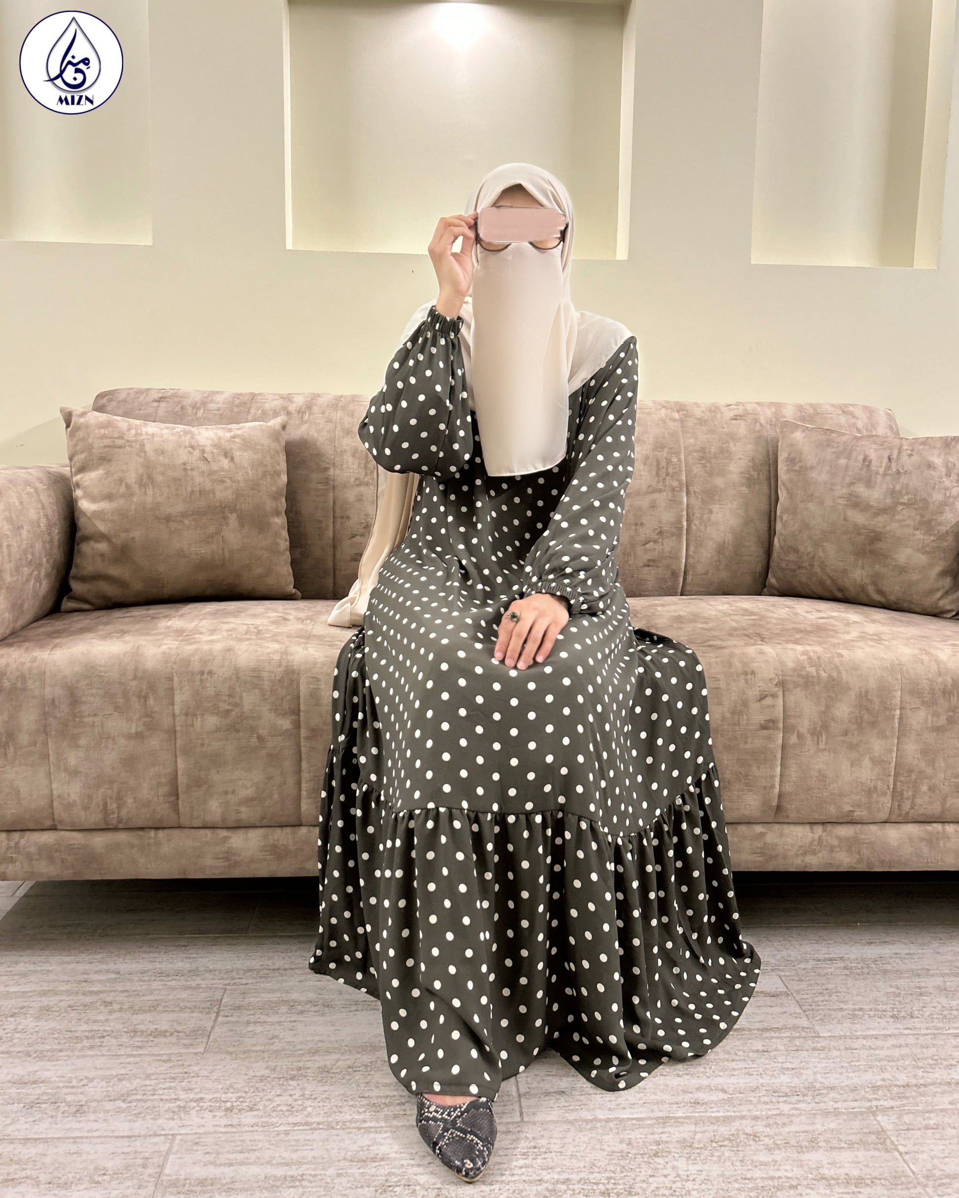 A one tier abaya with polka dot print for added grace . Made from Korean georgette this abaya is perfect for breathable and perfect as a hajj abaya. It also has wudhu friendly sleeves