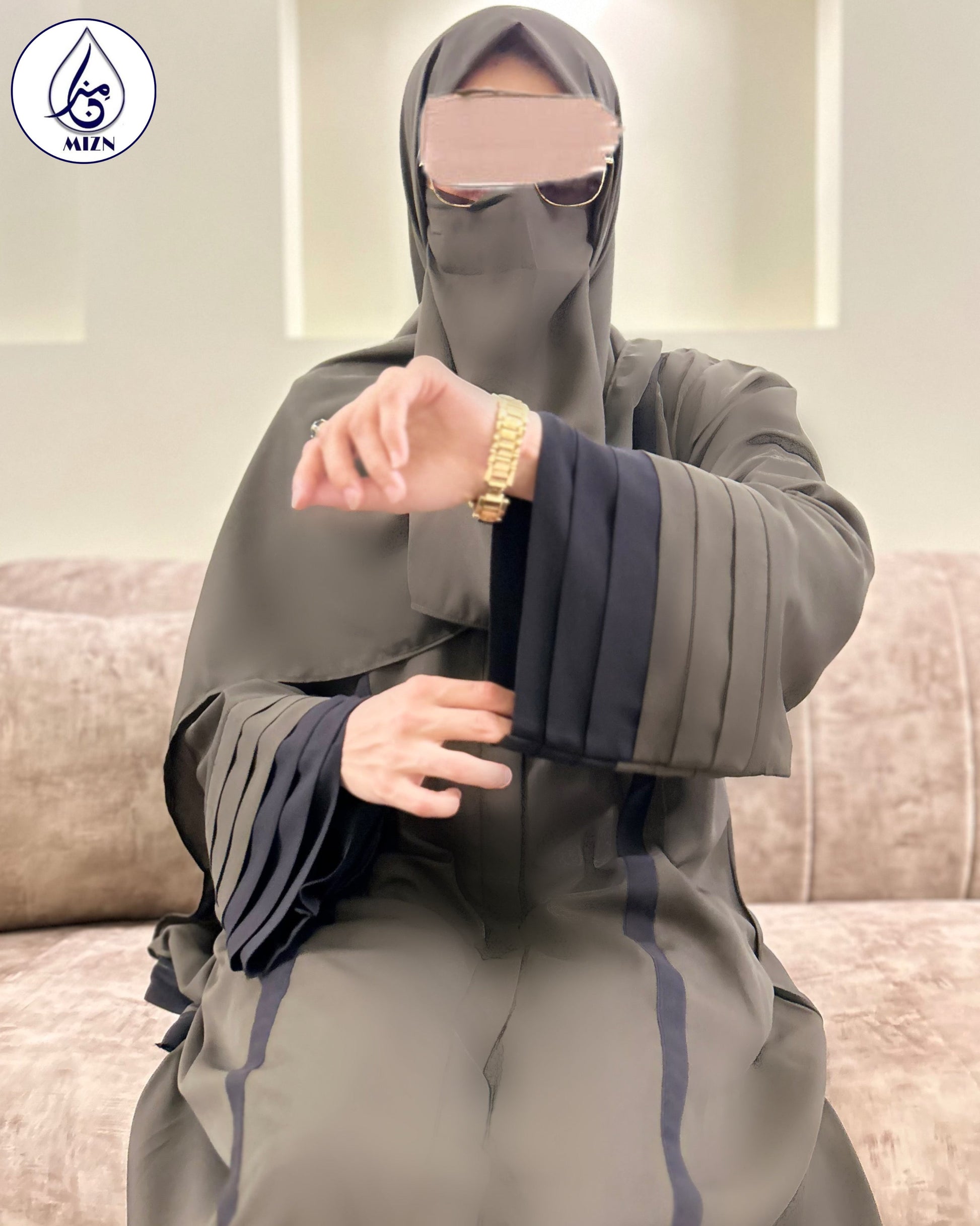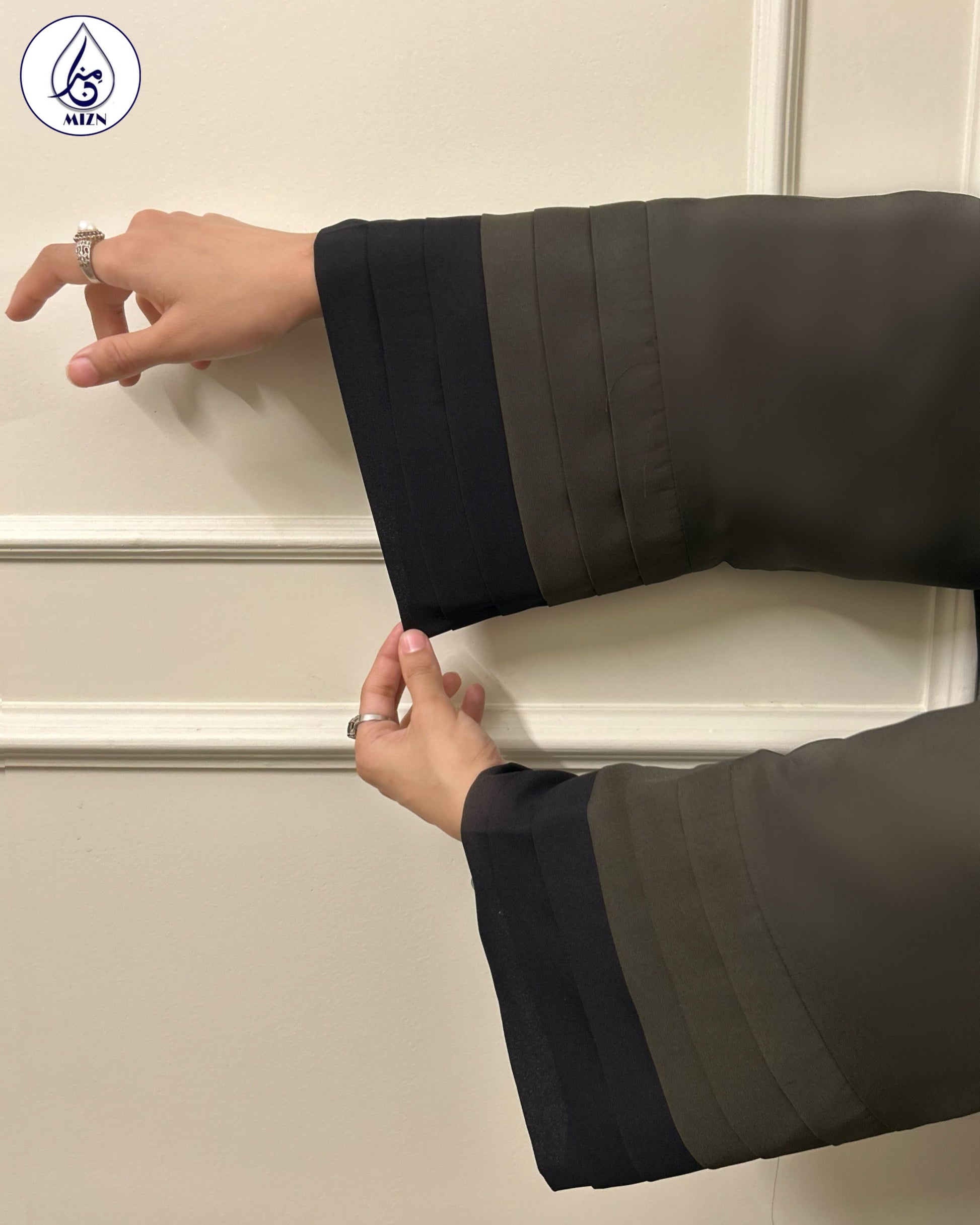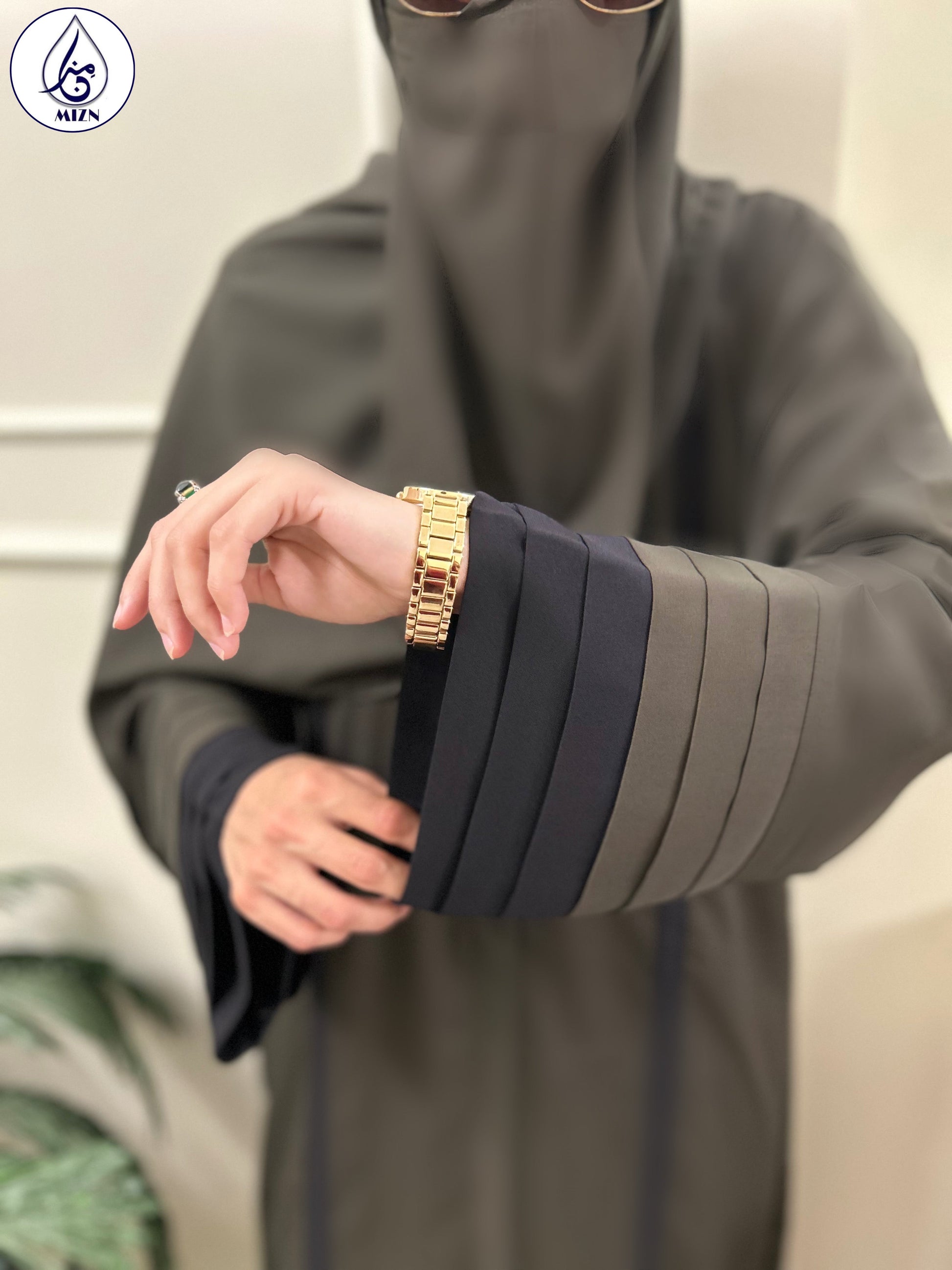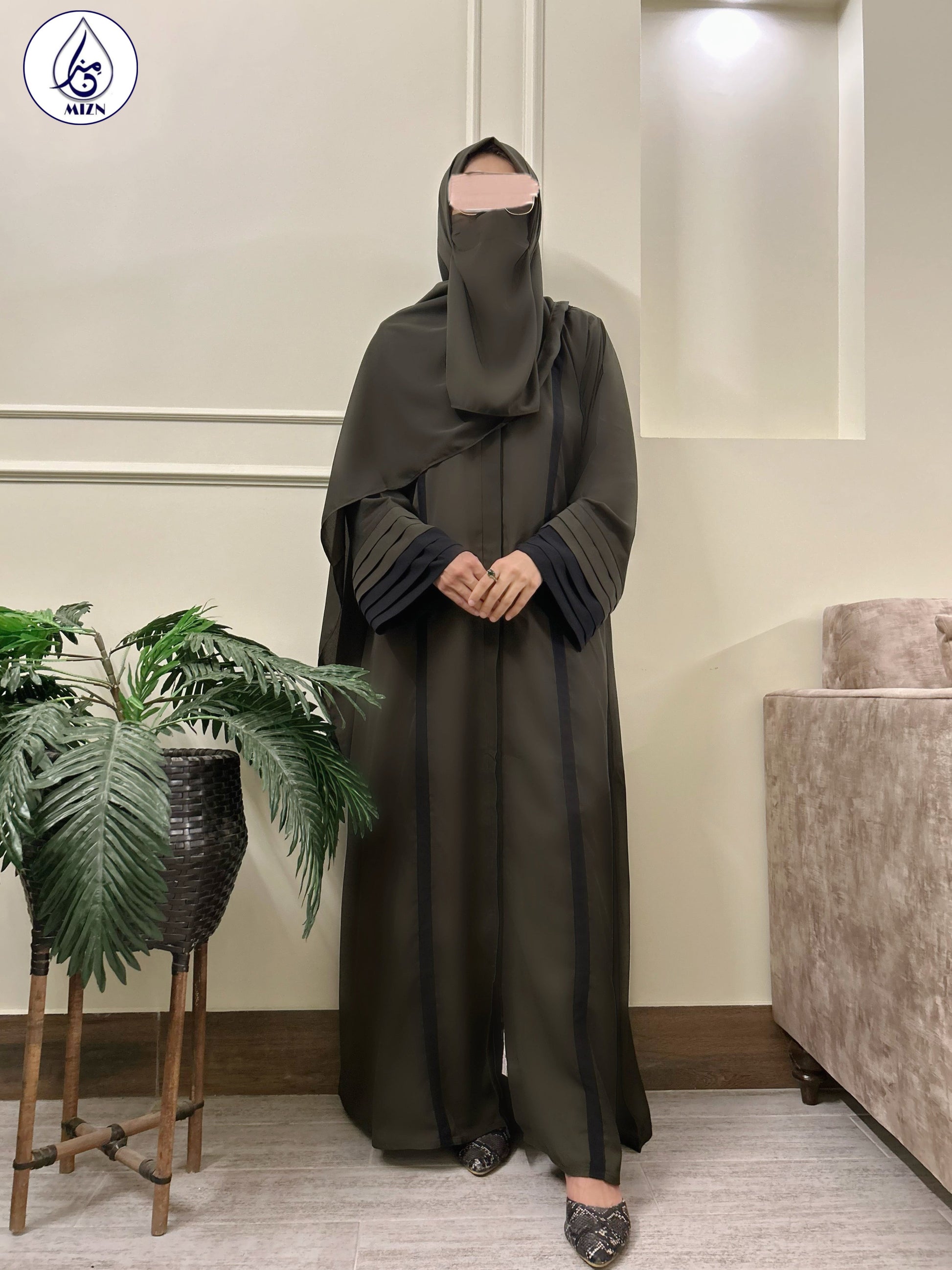 An olive green abaya with color block sleeves and black details. A minimal hajj abaya made of Breathable Korean georgette and perfect for summers