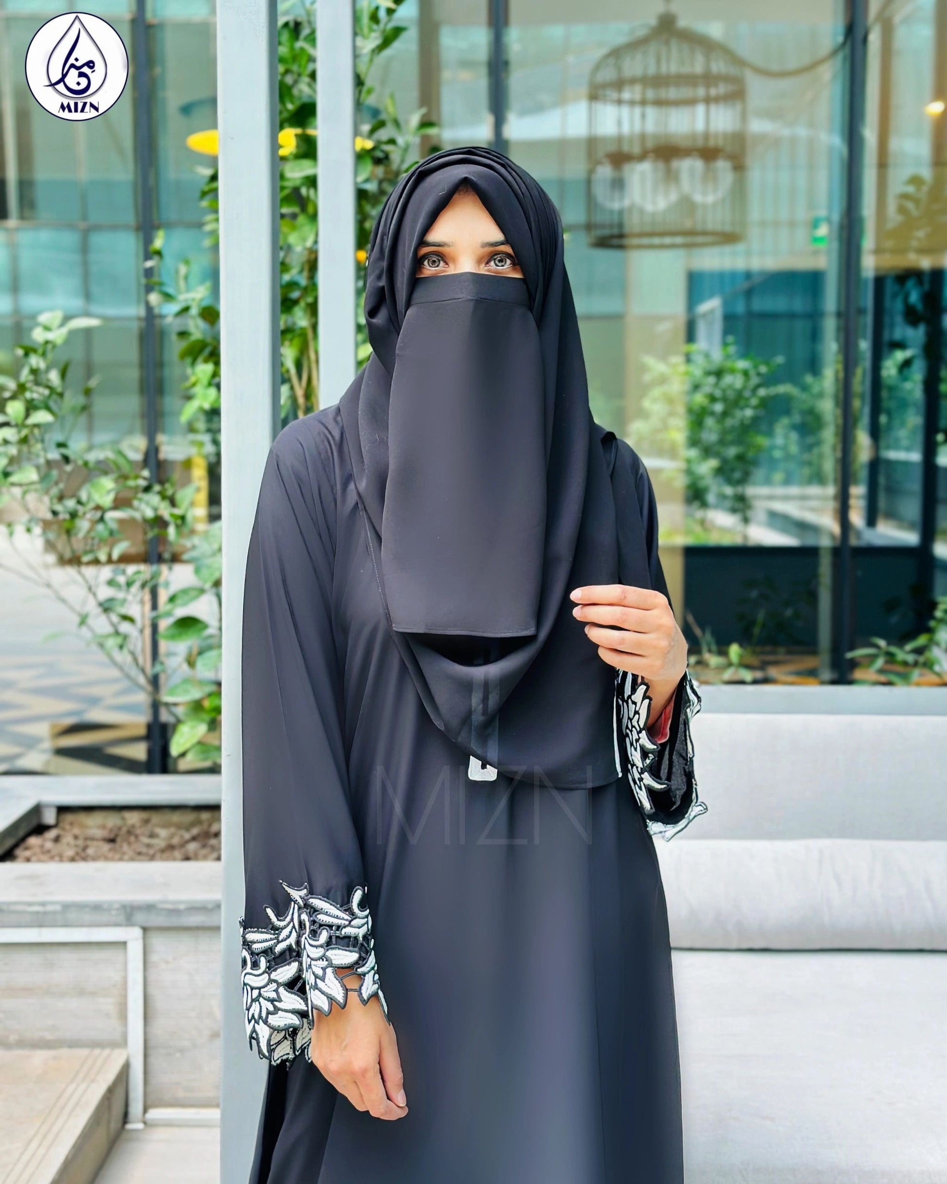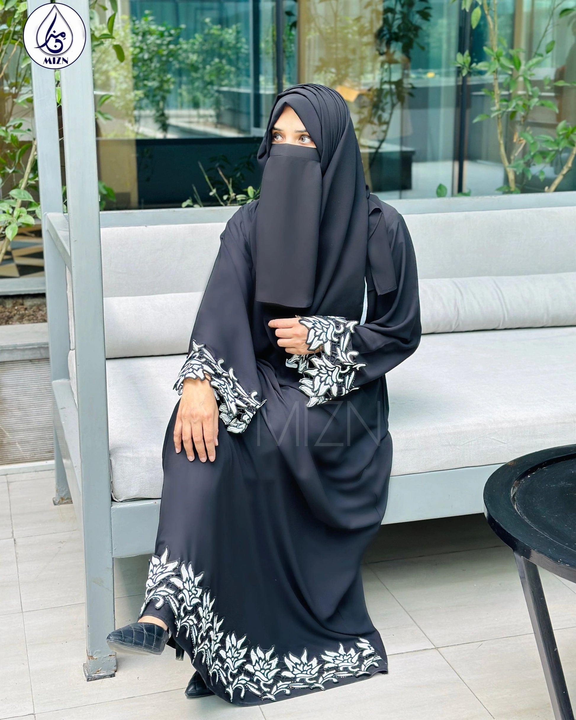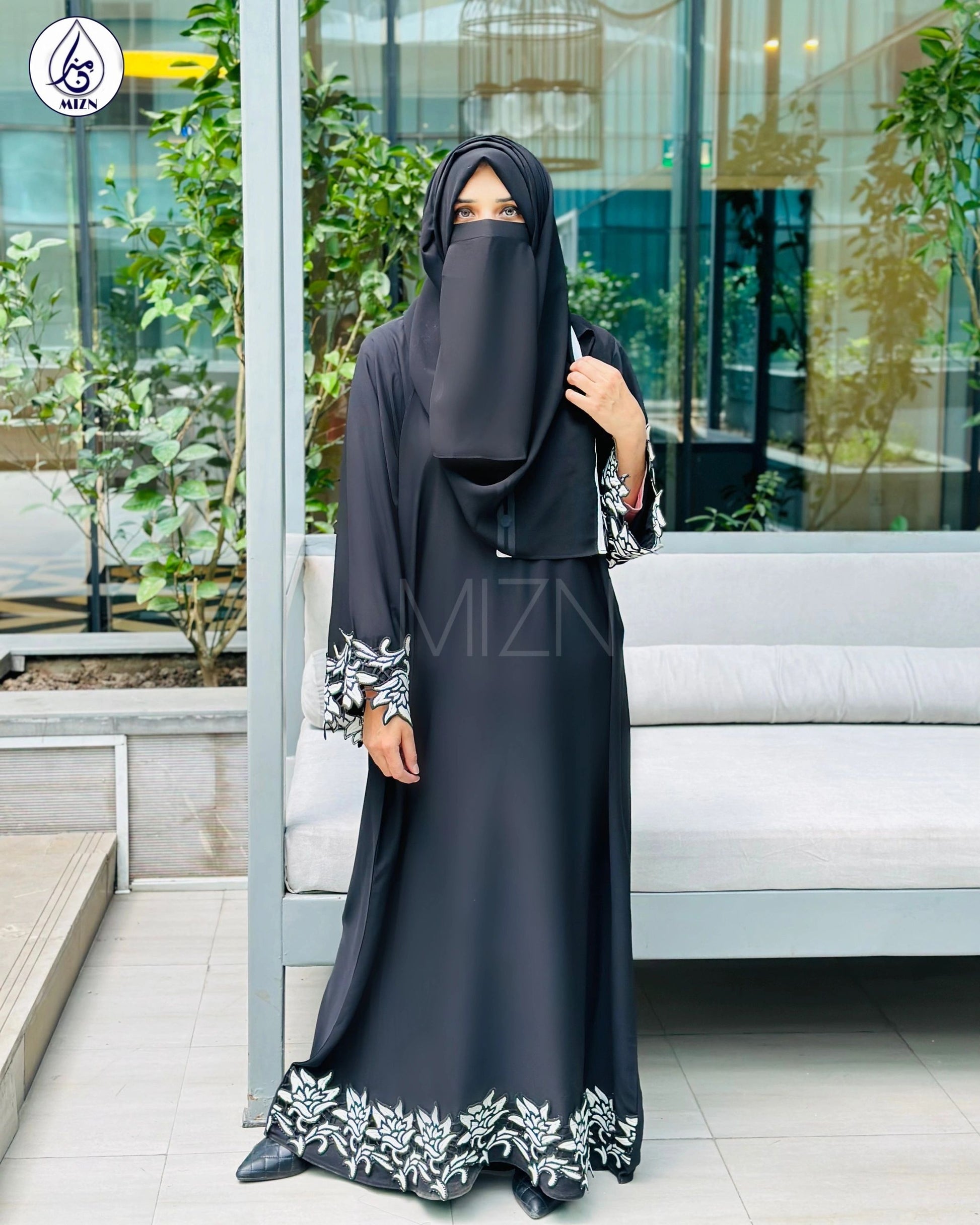 Where black meets white. This black abaya for women is sleek and simple. It an abaya design for women who love black color