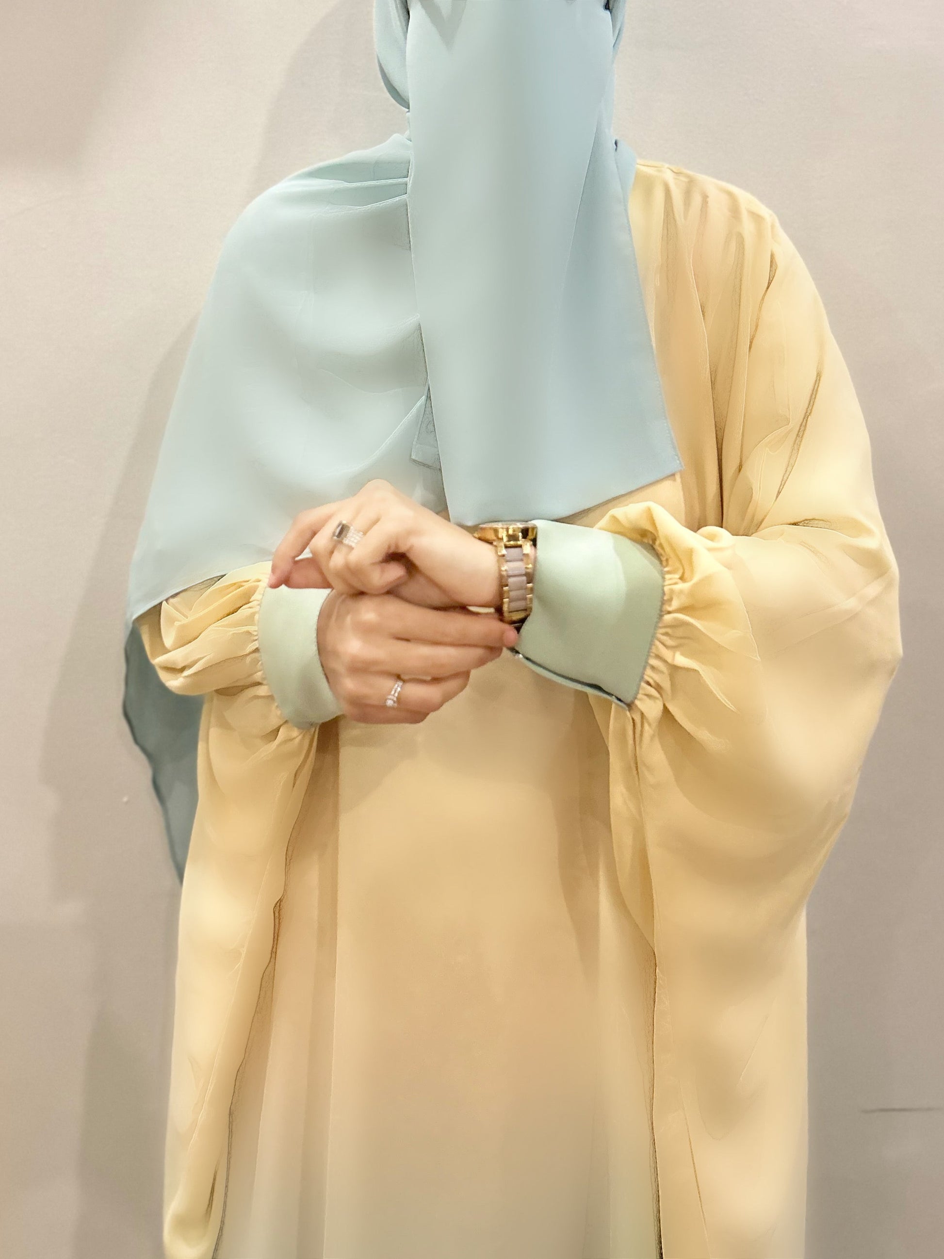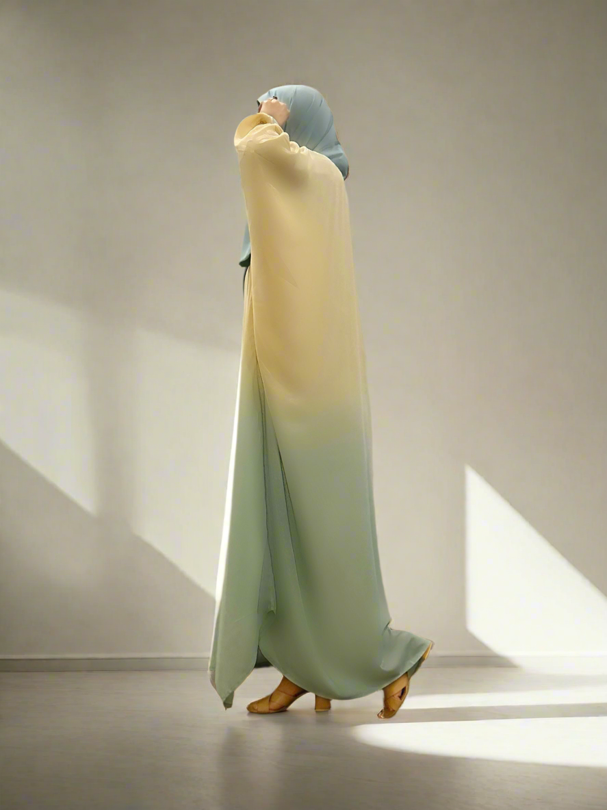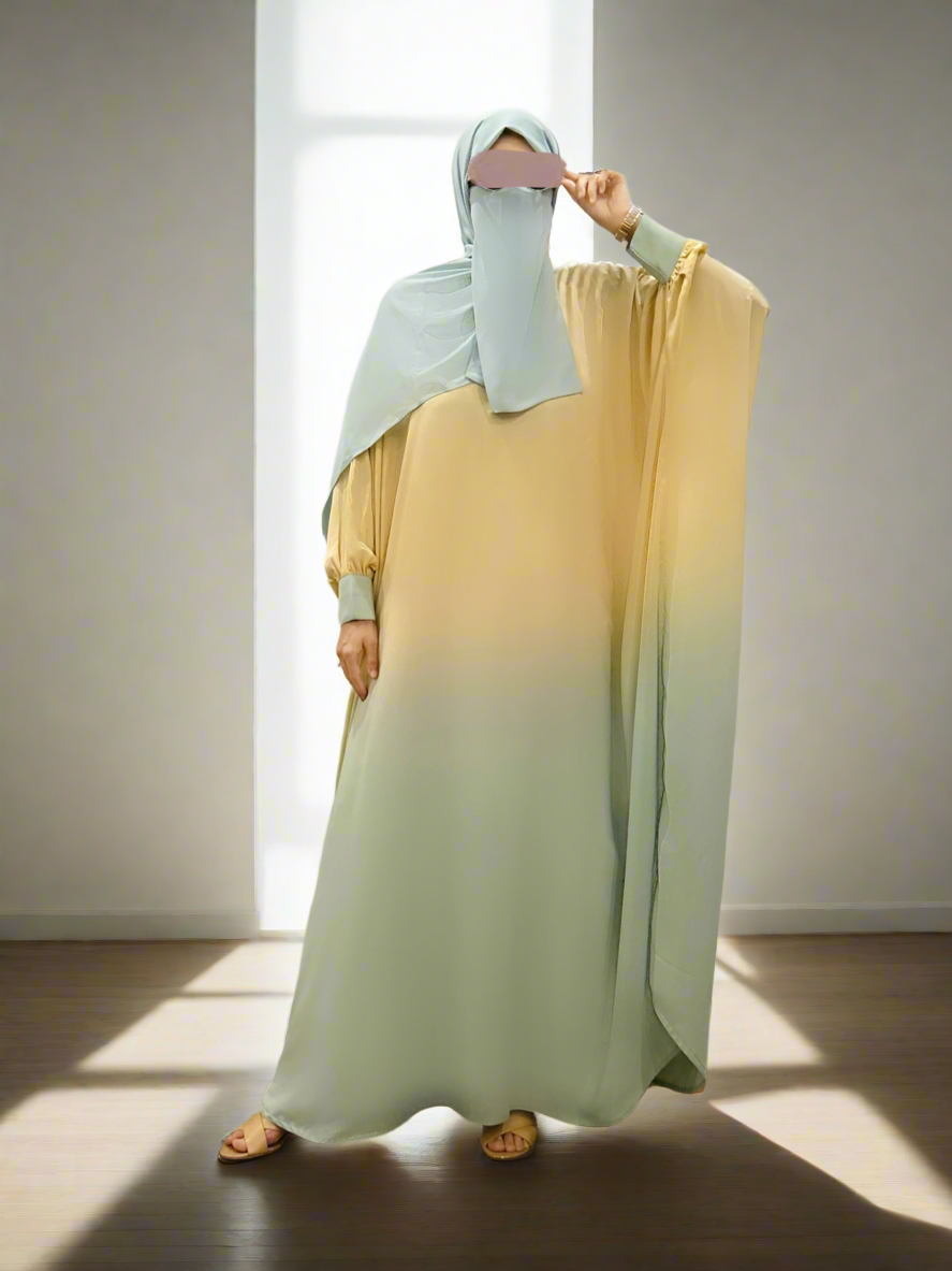 A two toned abaya with ombre of yellow & green. This butterfly abaya in kaftan style is flairy and summery. With cuffed sleeves and breathable fabric, it is a perfect umrah abaya 🛫🕋