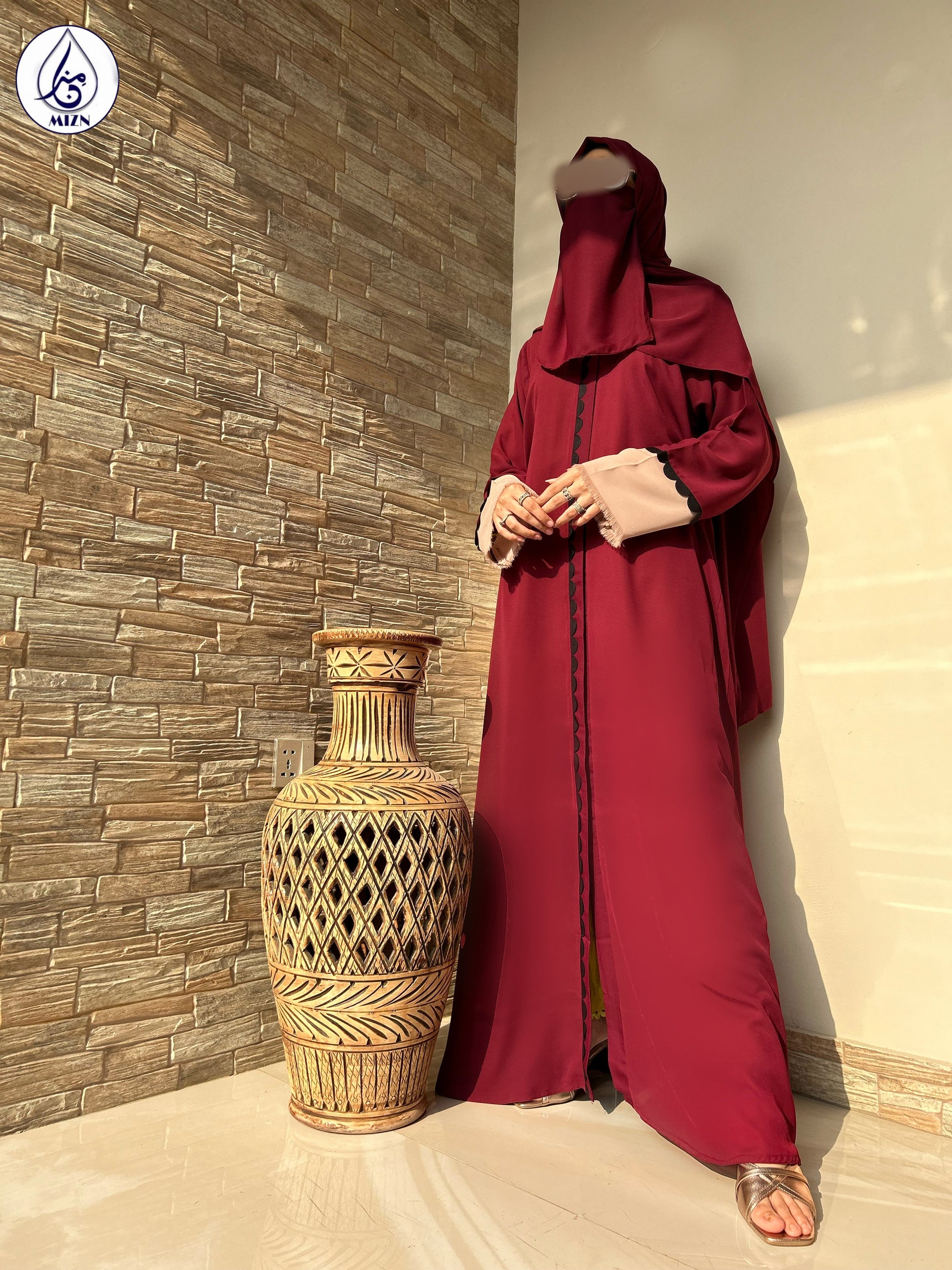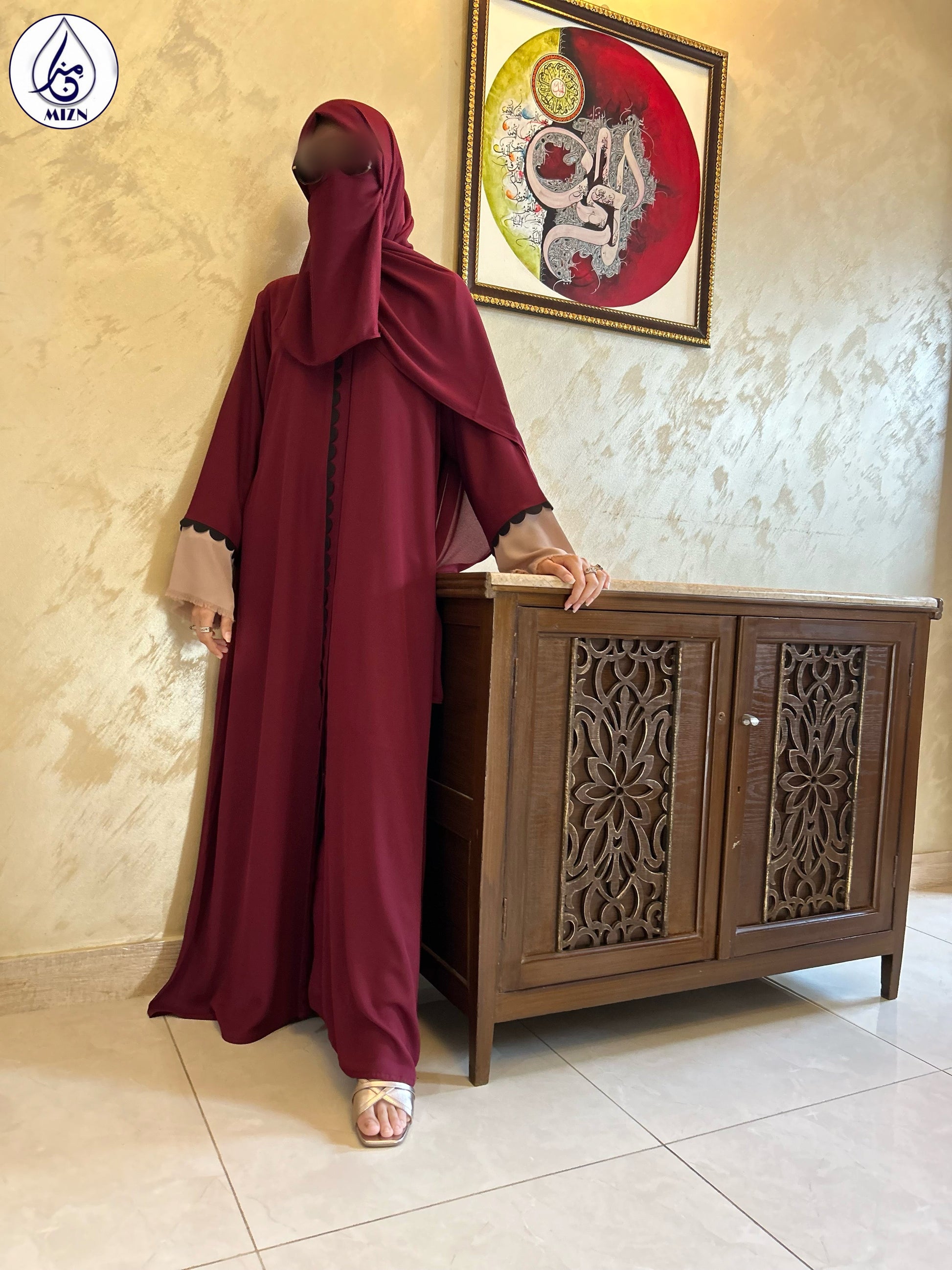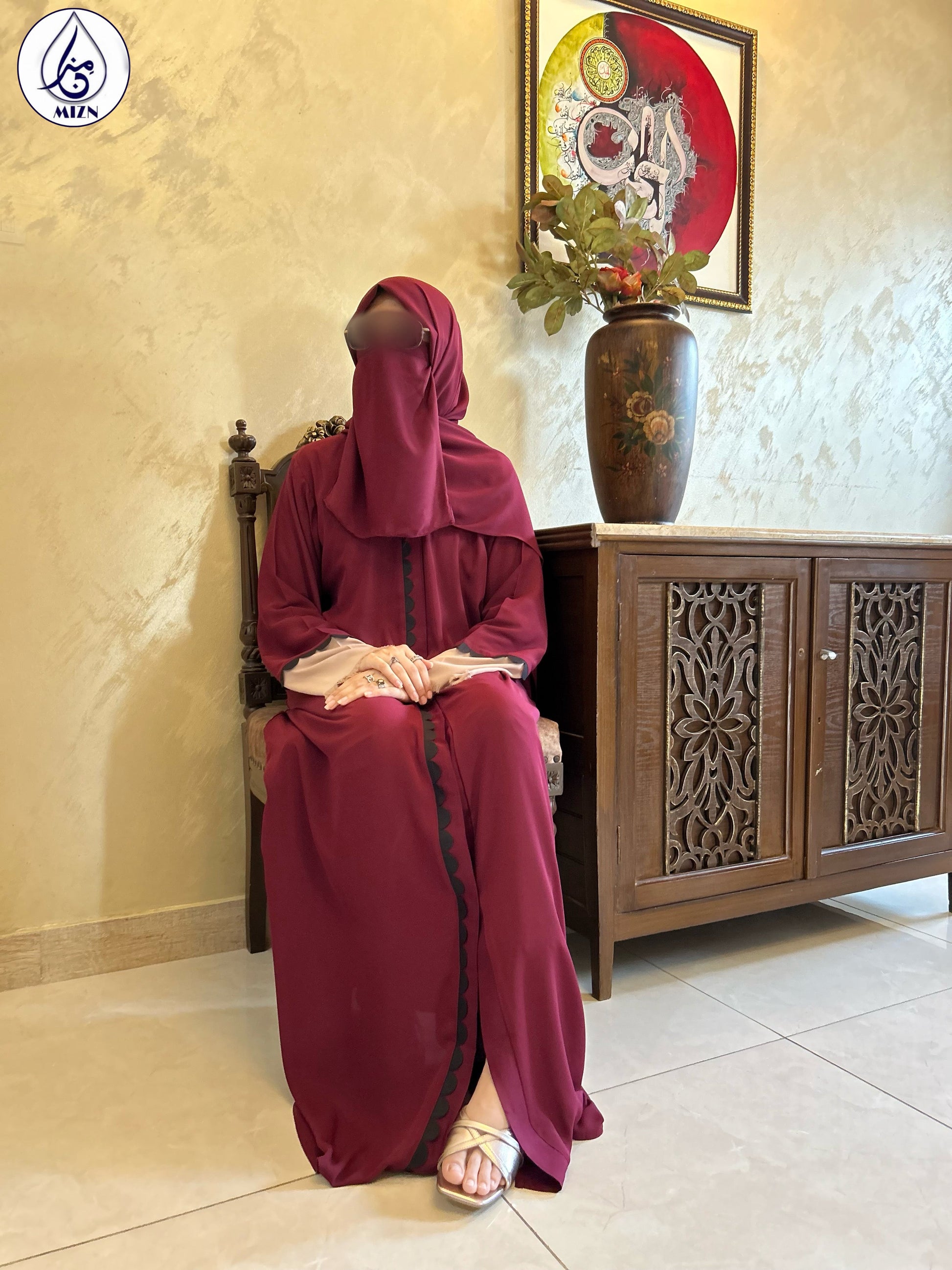 An abaya that is very close to our heart. ♥️ The color combination reflects passion and the scalloped details are heavenly.