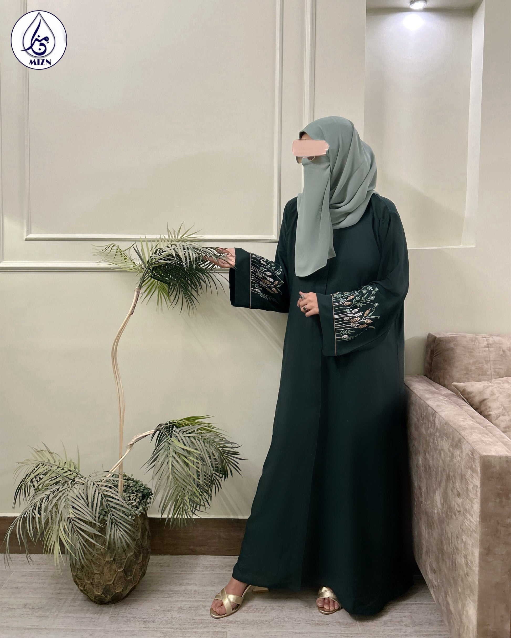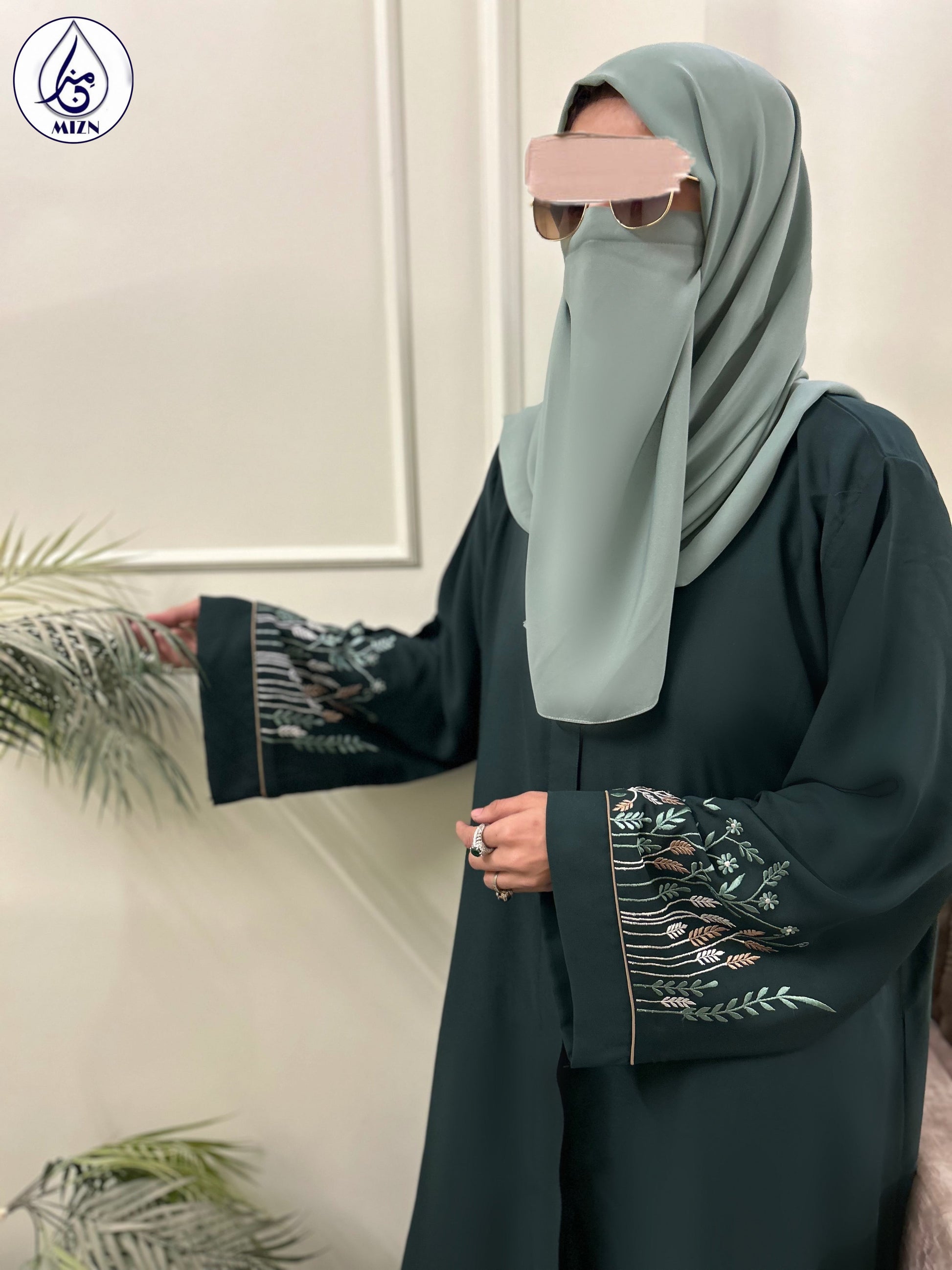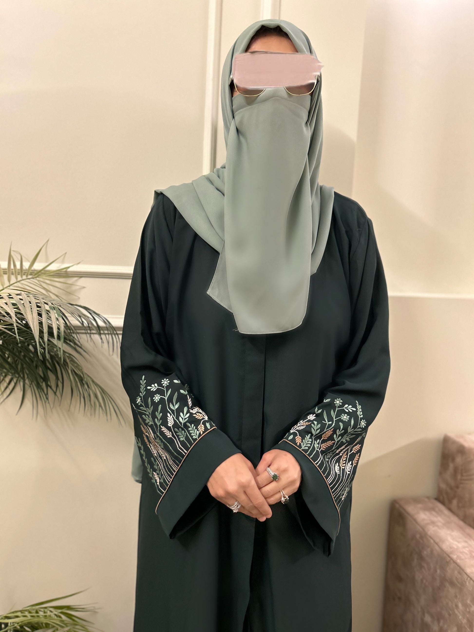A Green abaya with the most dainty sleeves😍 A forest inspired embroidery abaya that reflects the love of nature with beautifully crafted sleeves