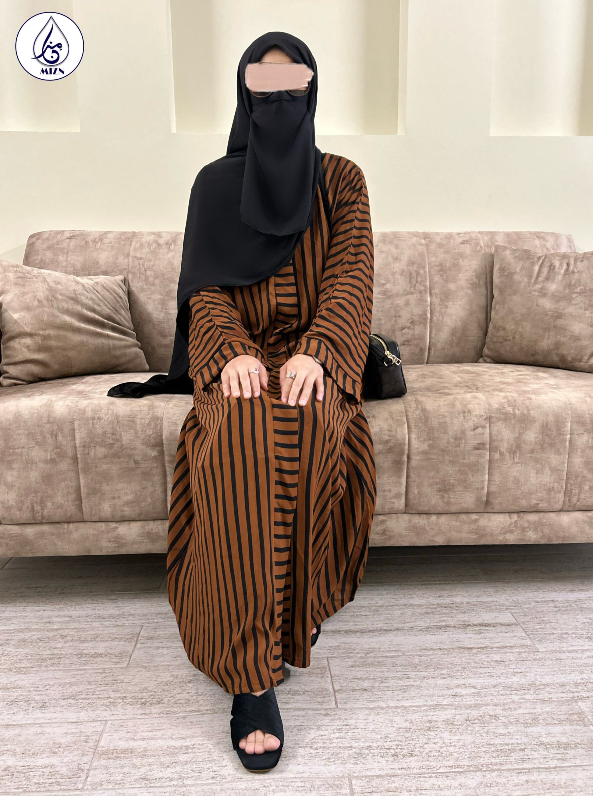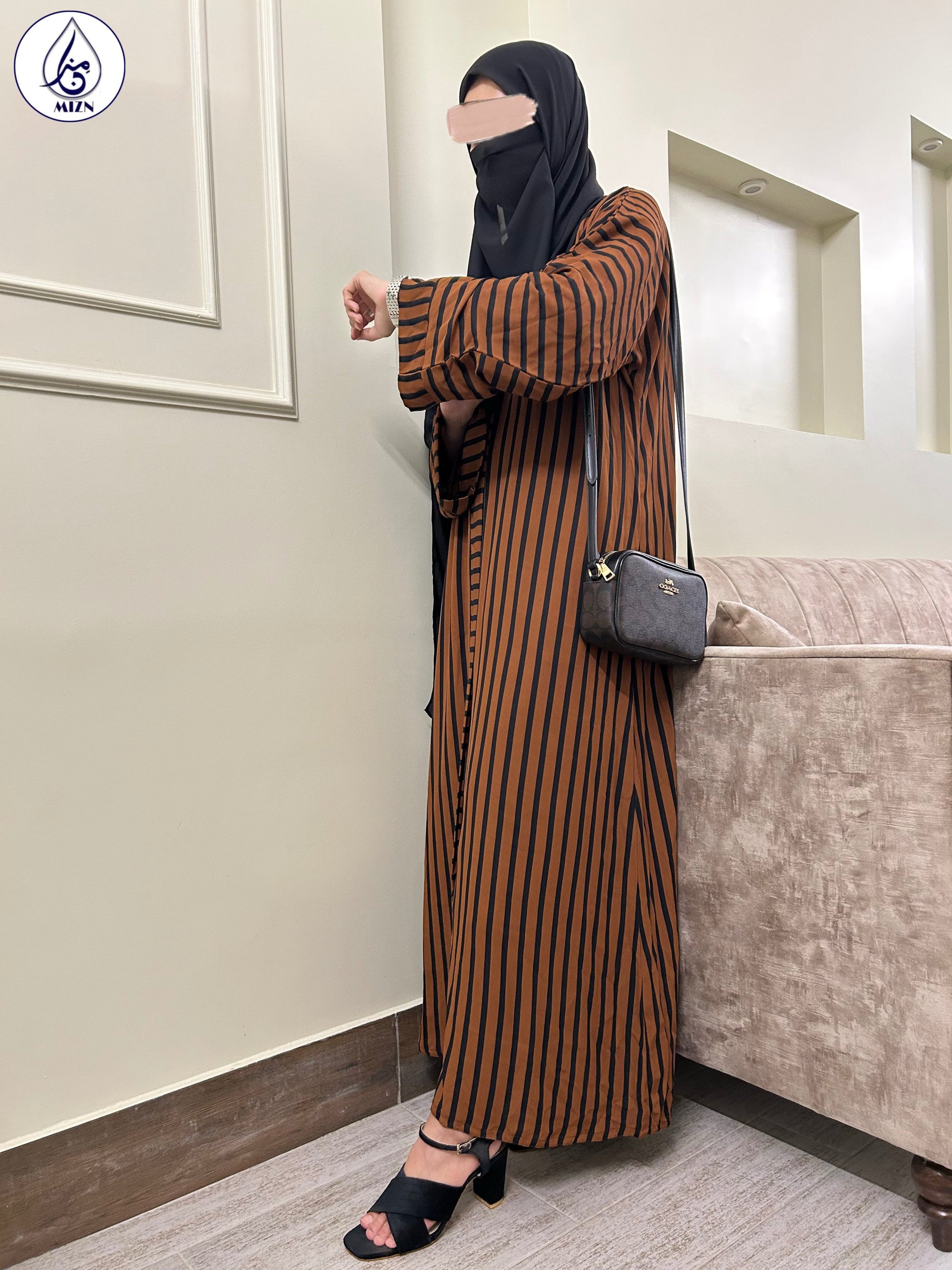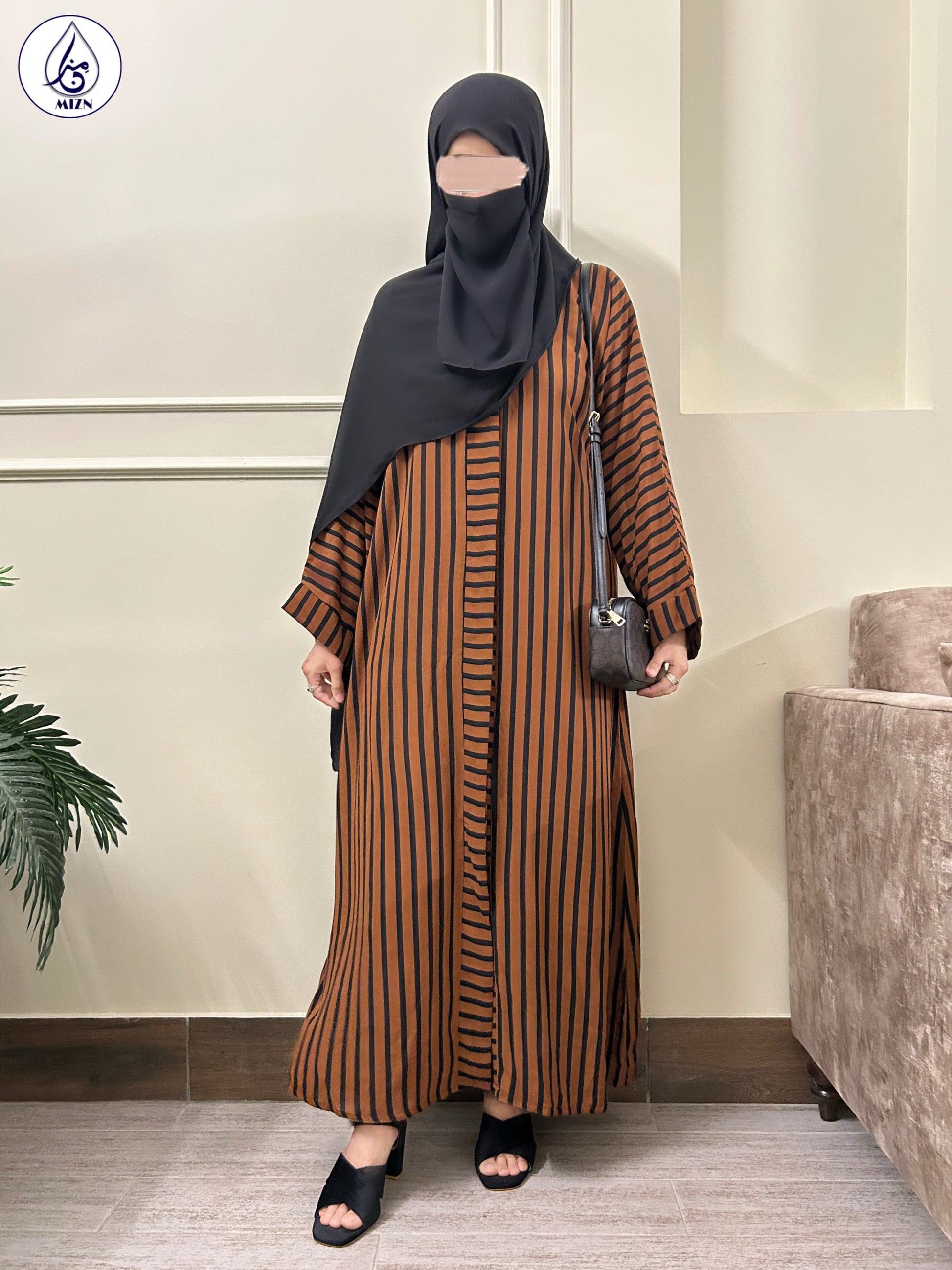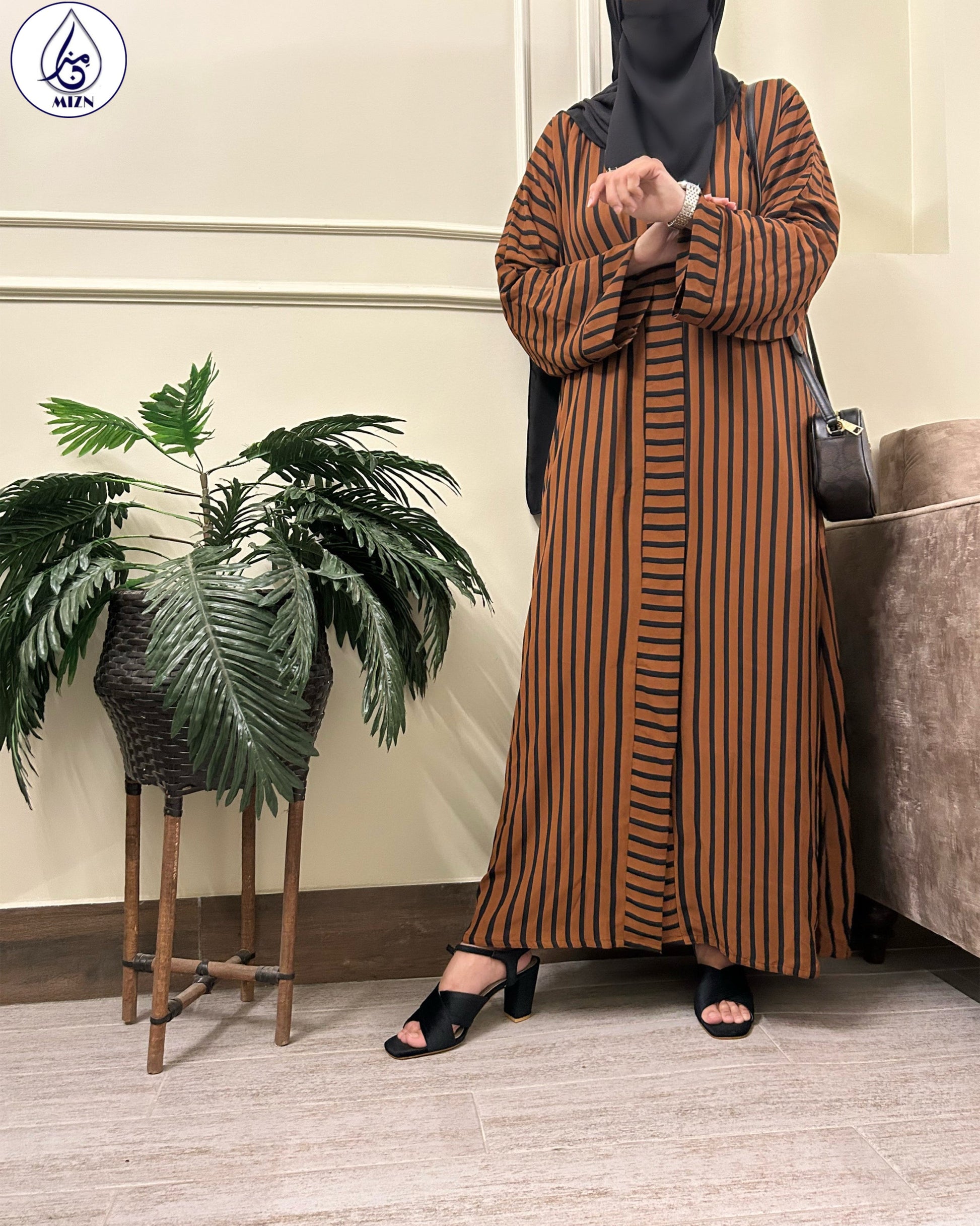 A rust button-down abaya design with stripes printed all over. With a sleek cut this black abaya gown can be worn daily to beat the heat