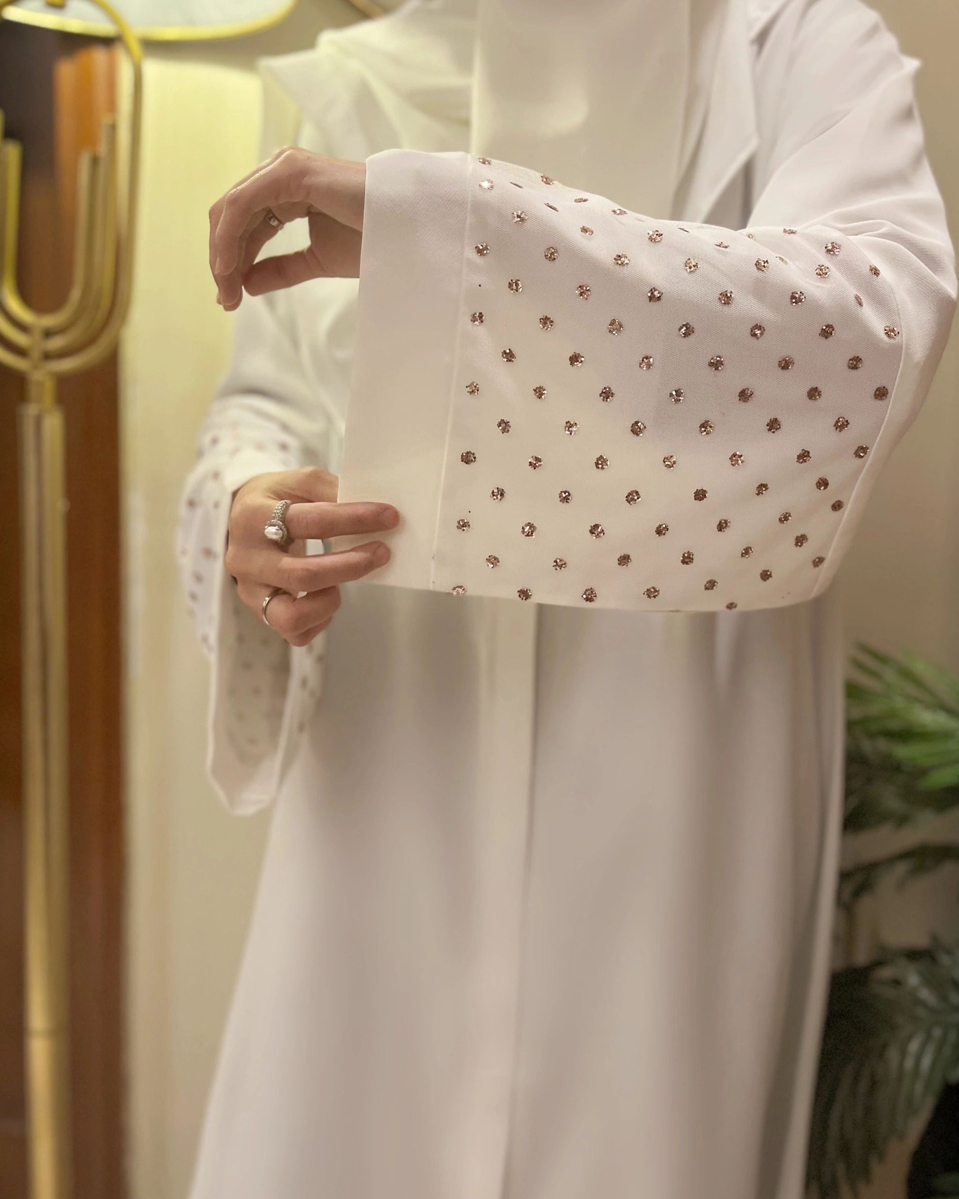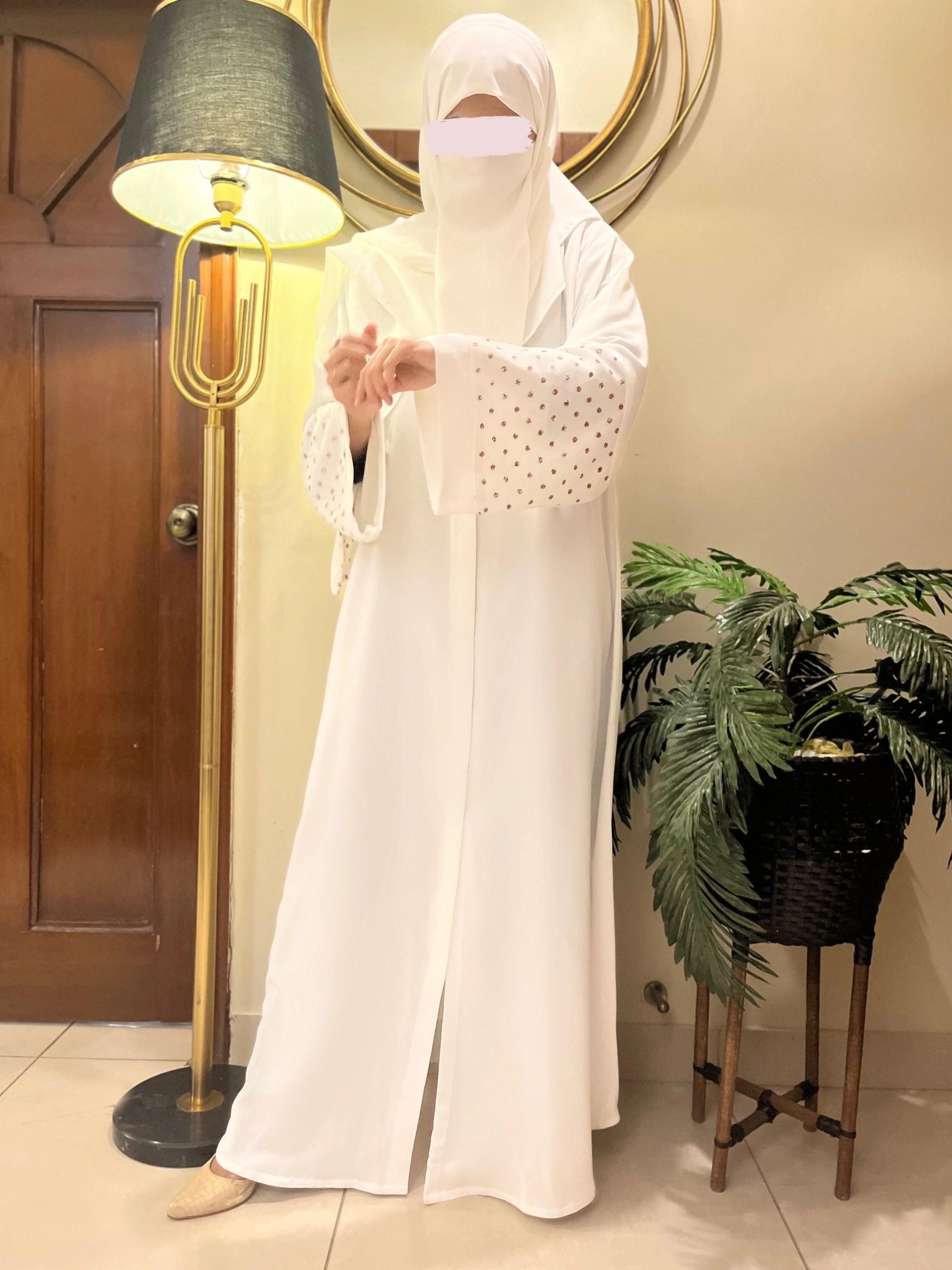 A white beauty with ethereal sleeves. This white abaya design is beautiful yet minimalist