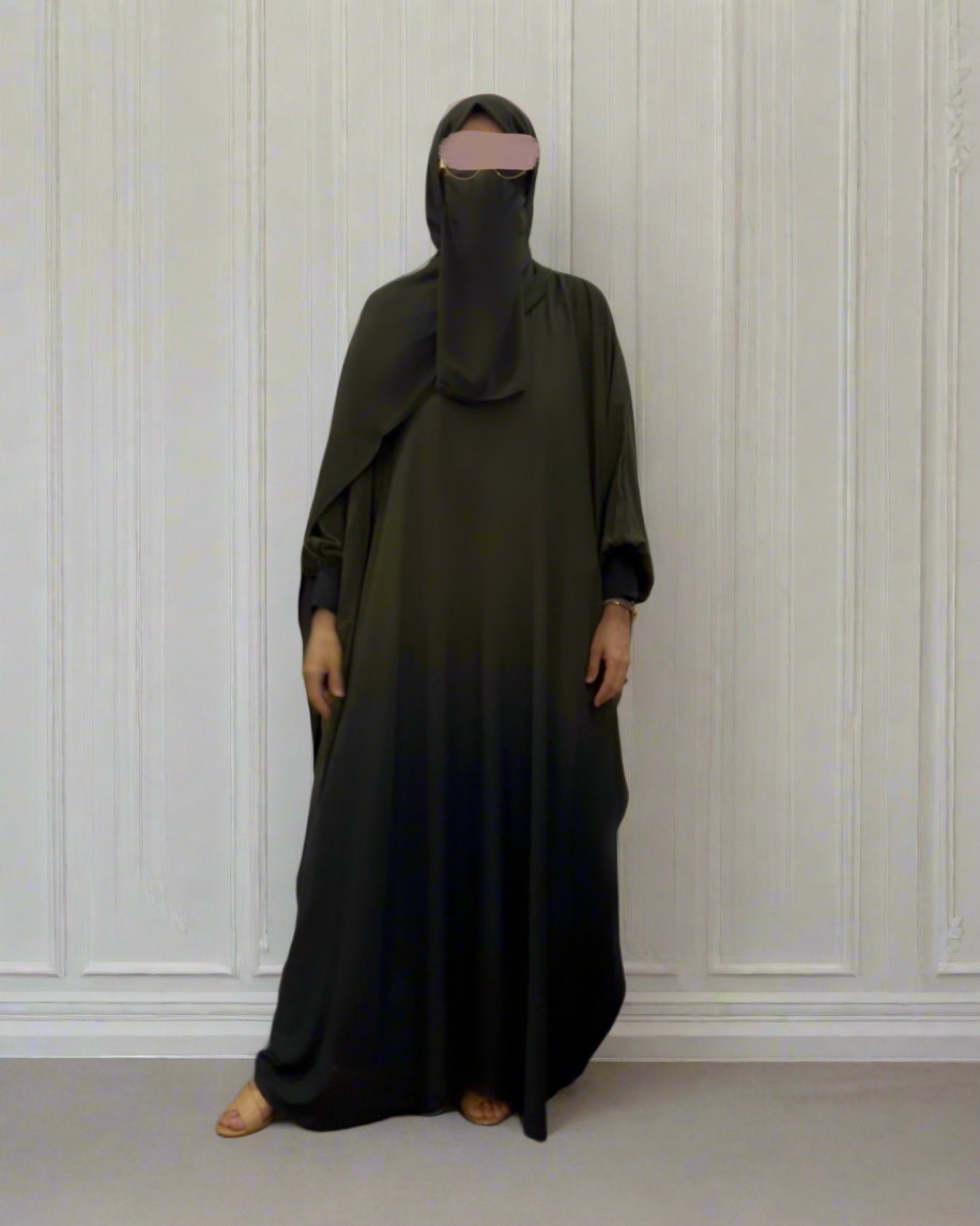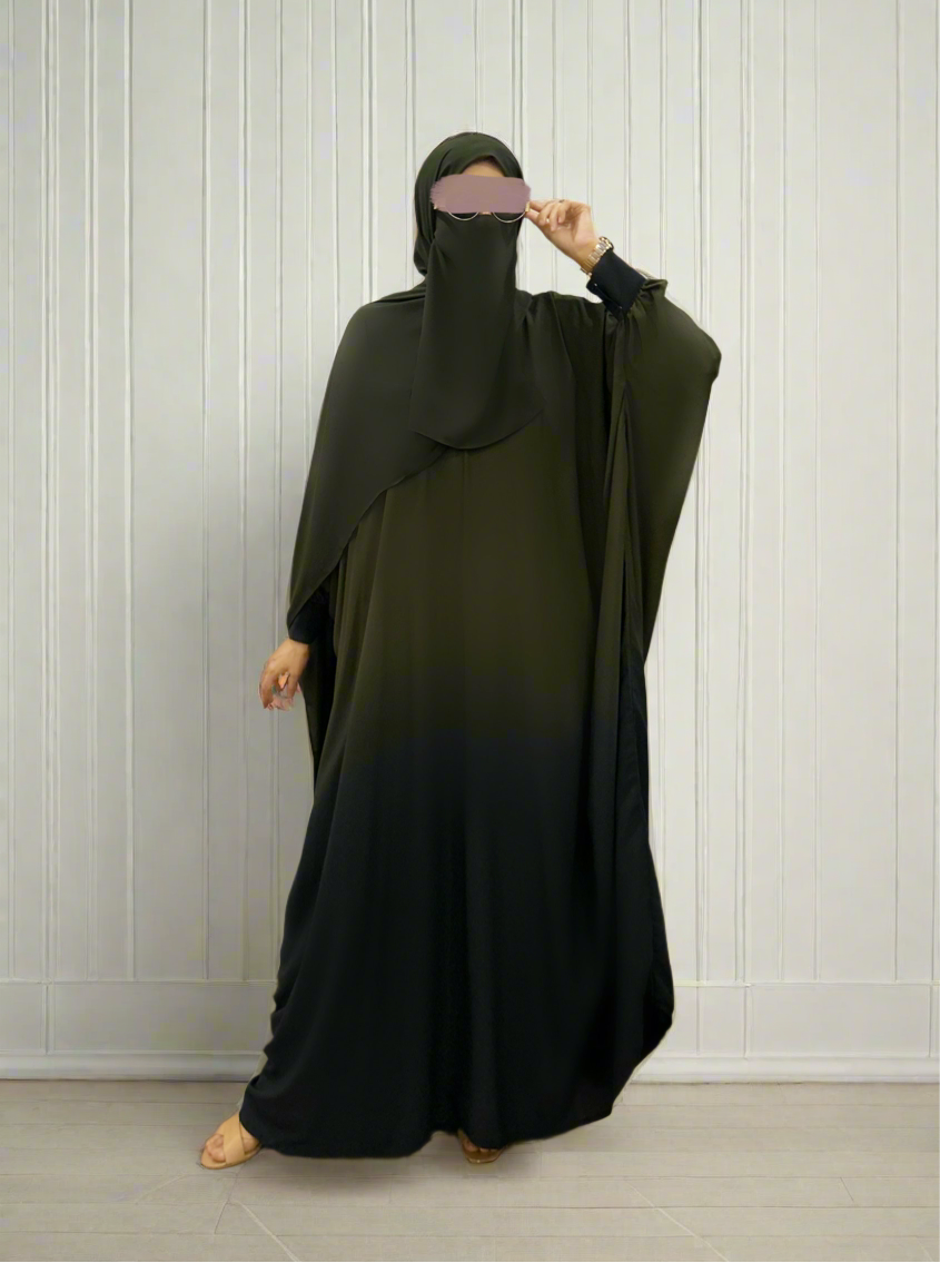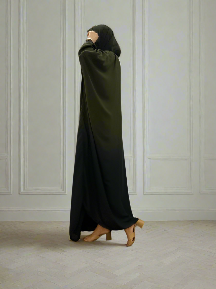 Another olive abaya with two shades combined to give an ethereal feel. This butterfly abaya with kaftan design and cuffed sleeves looks gorgeous and can be worn all season long. The fabric is lightweight and durable.