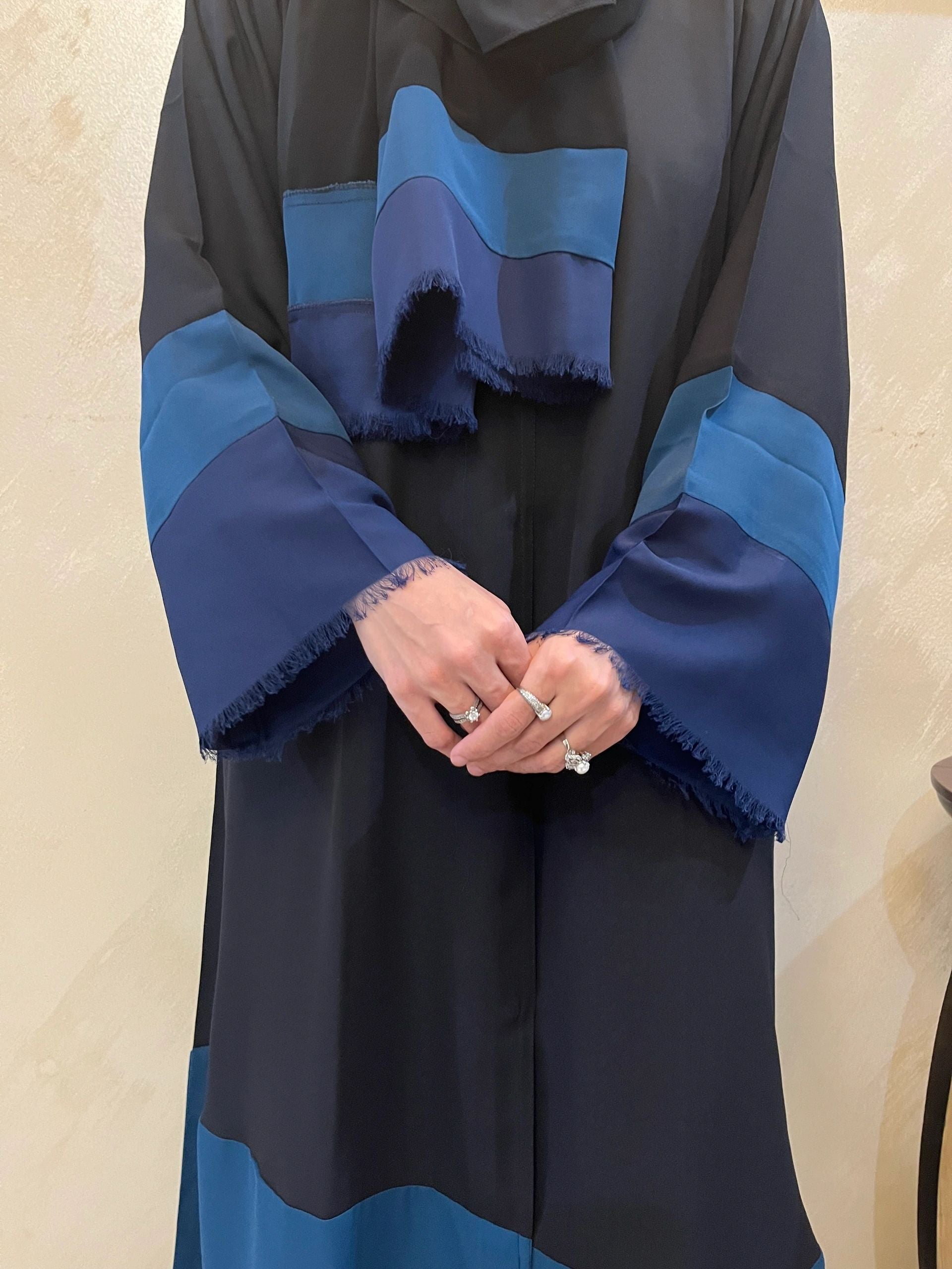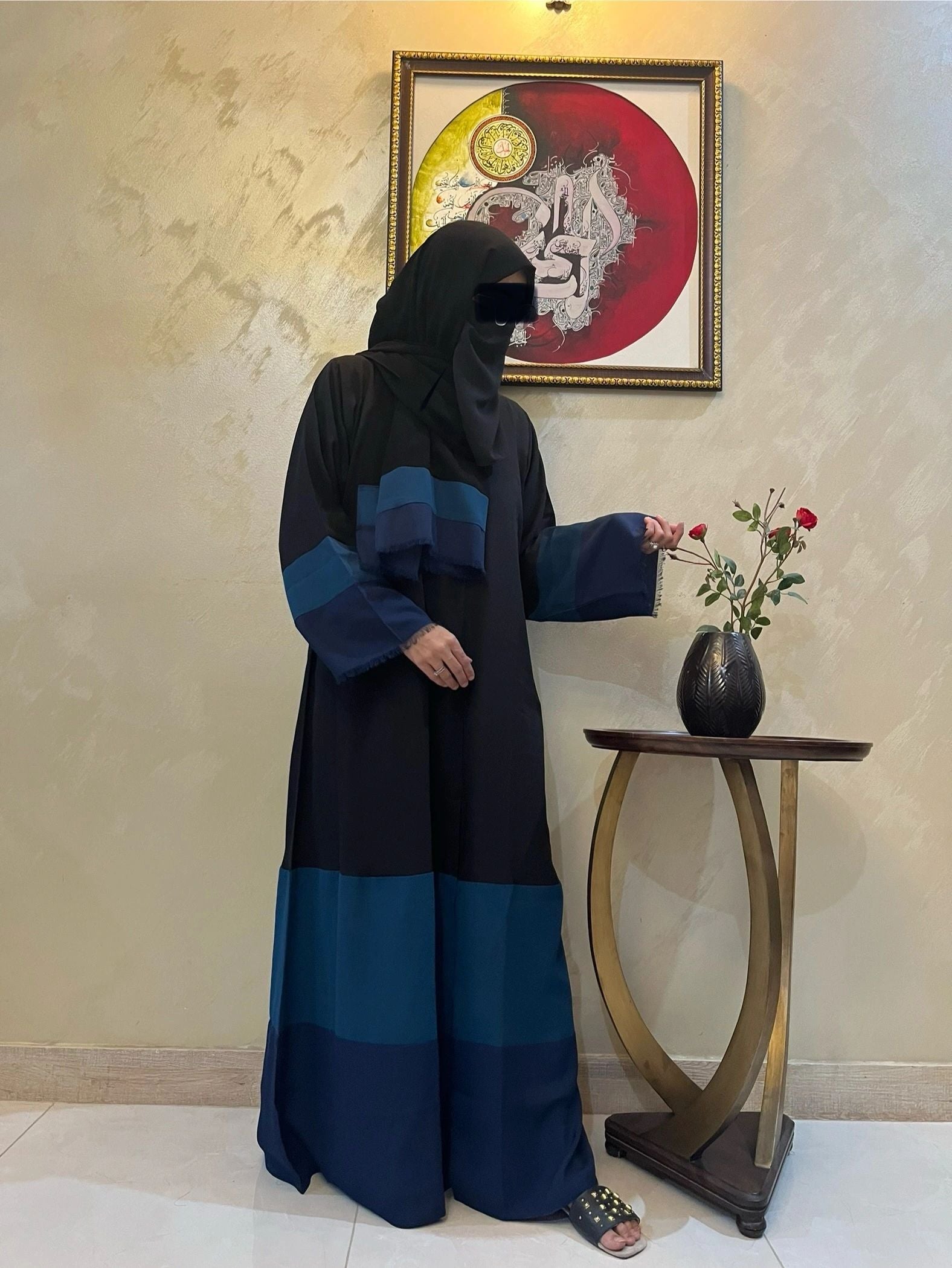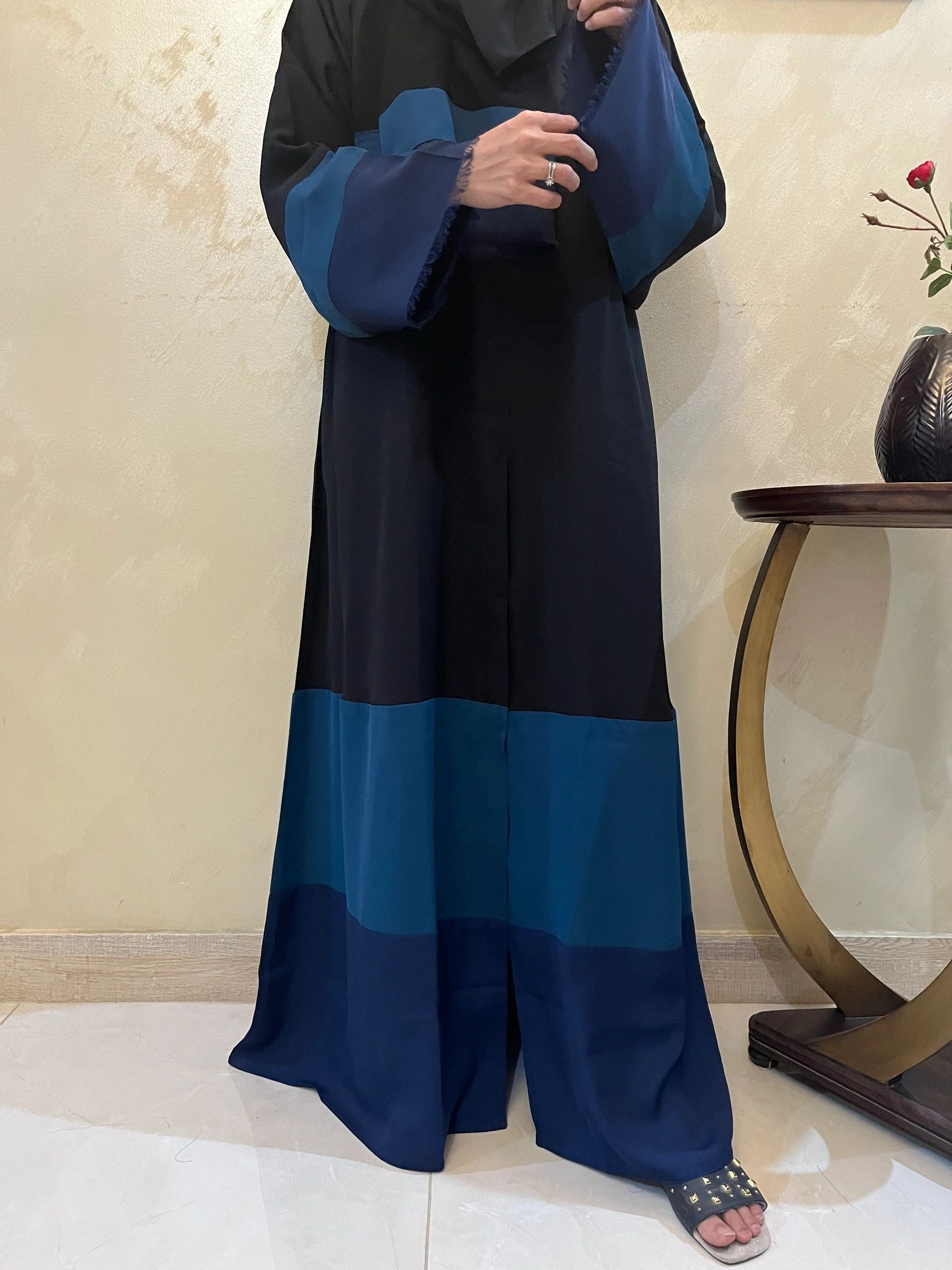 Where blue meets black. Two shades of blue join with black to create this color blocked abaya. It looks chic and elegant
