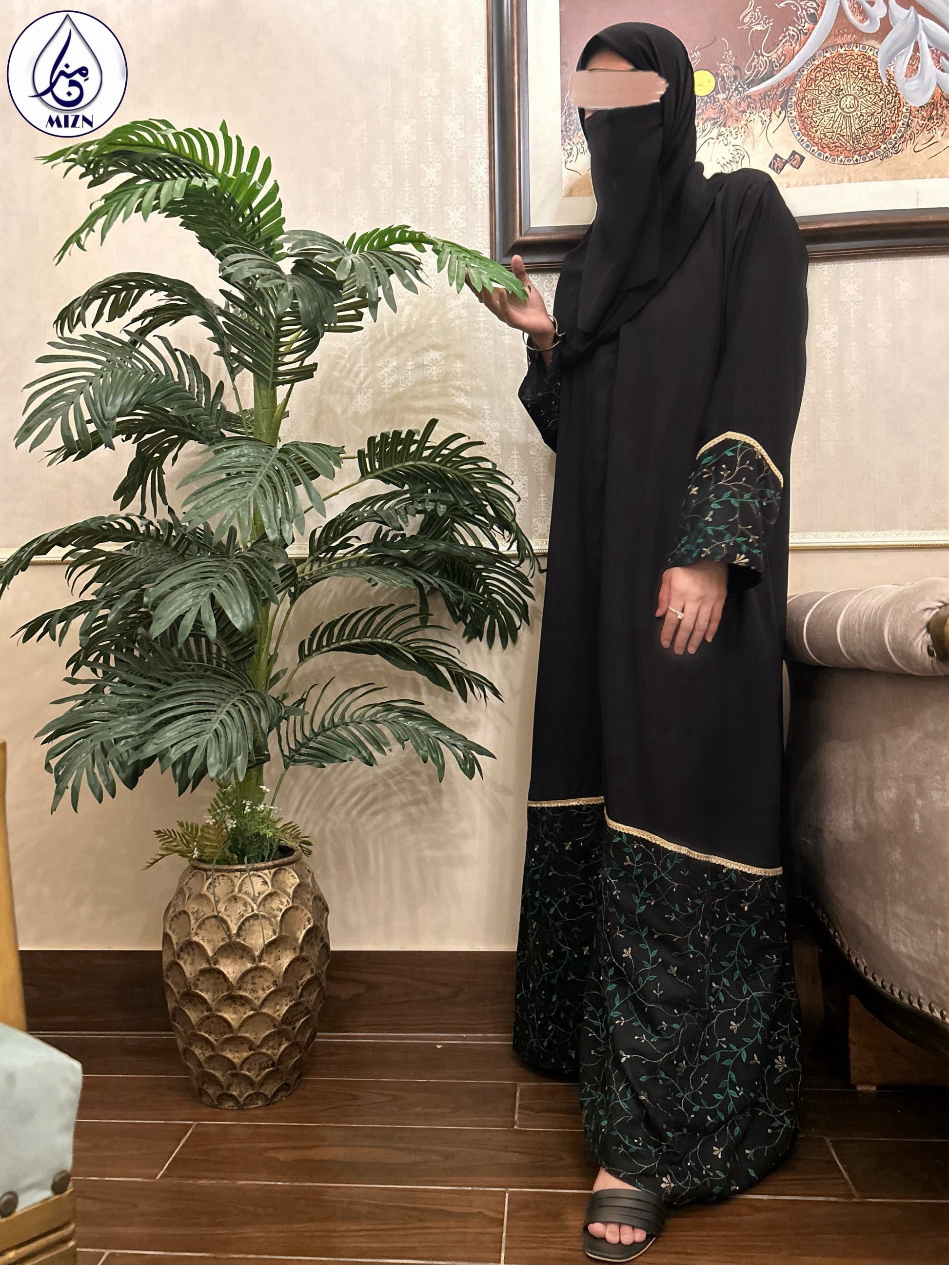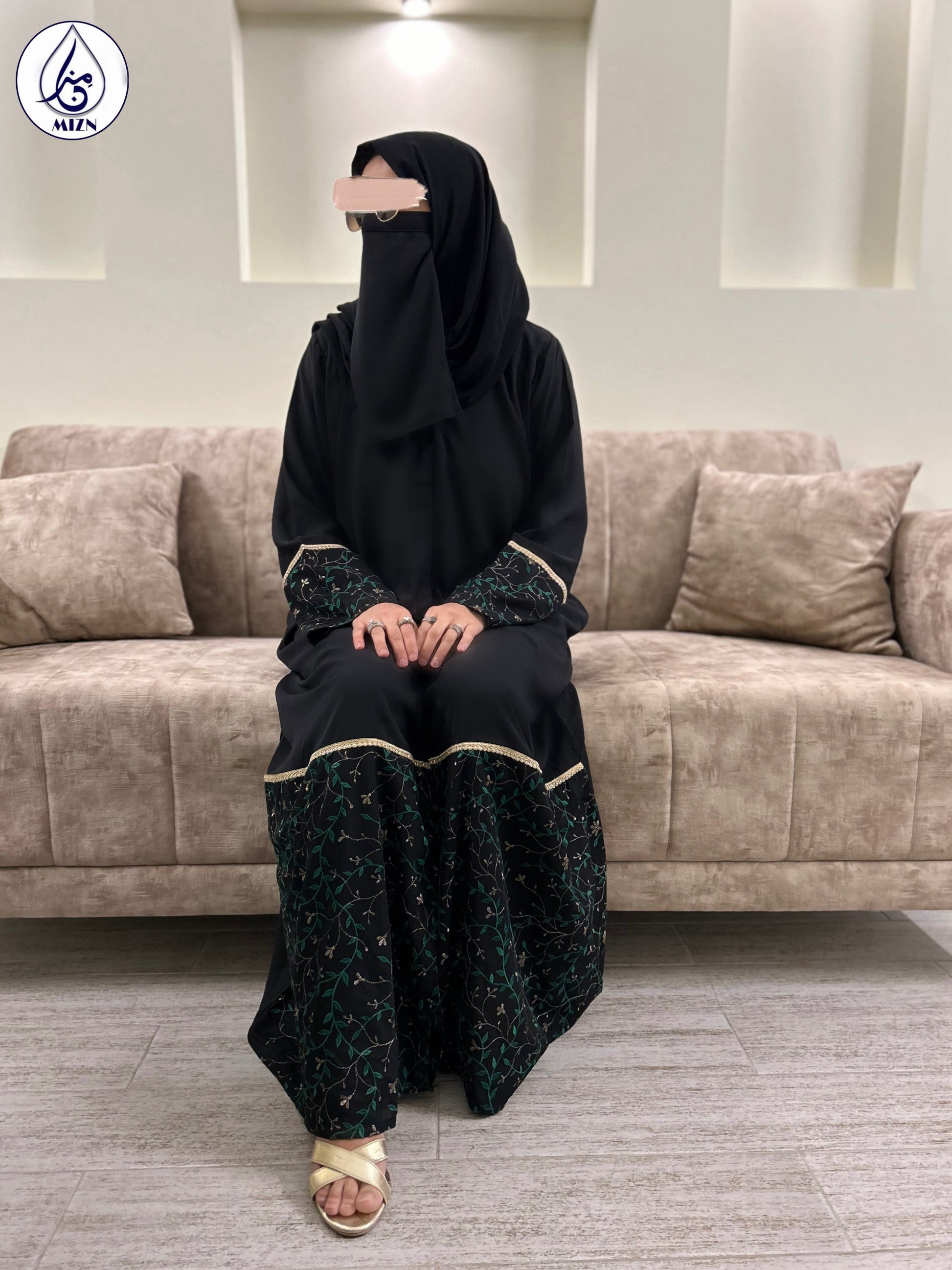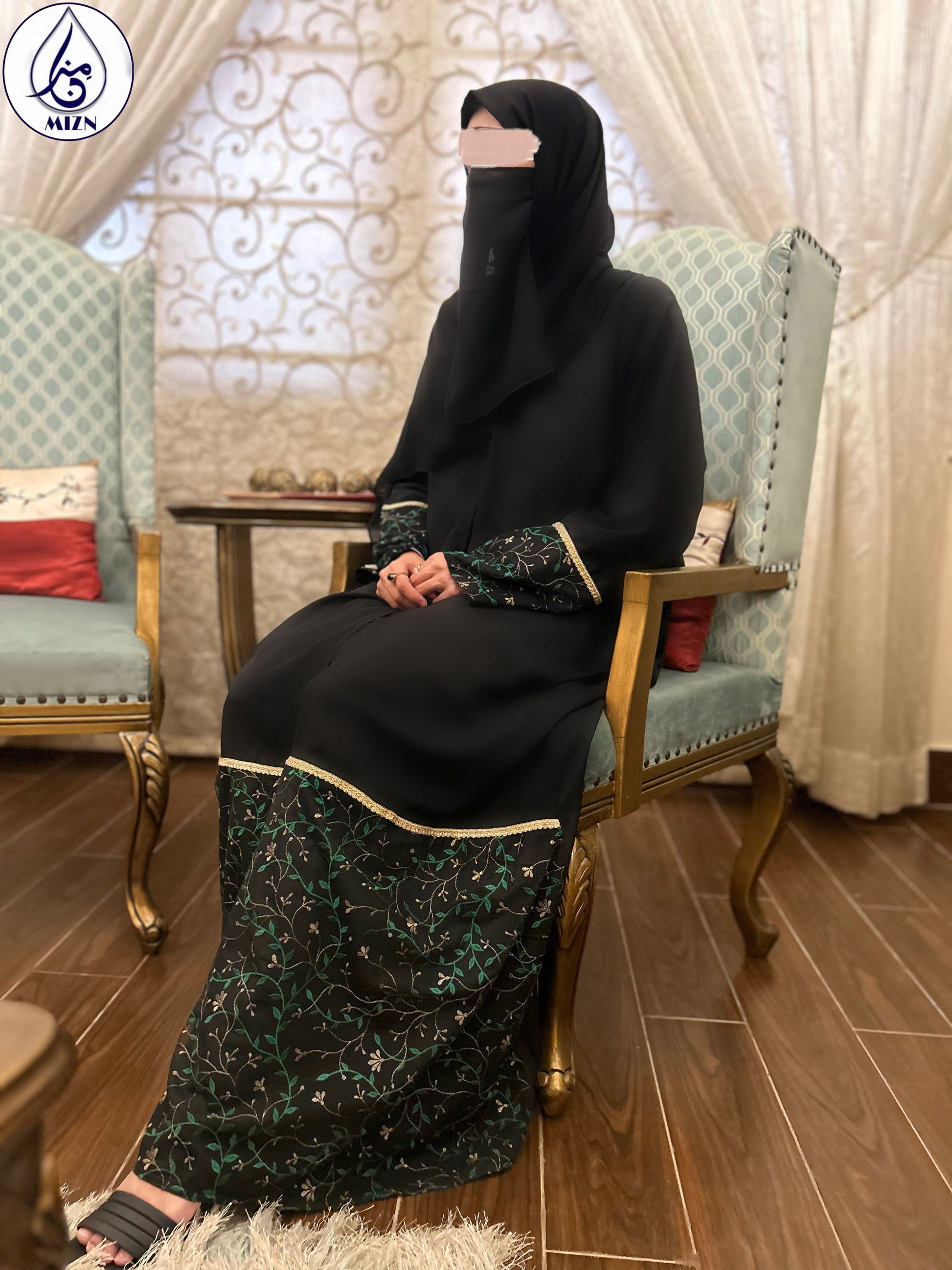 Black and gold never goes old🖤A black abaya which shines bright with green and gold😍 Make a statement with this exquisite wedding abaya laced with zari organza and finished with delicate lace. Let this black festive abaya weave charm around your festivities